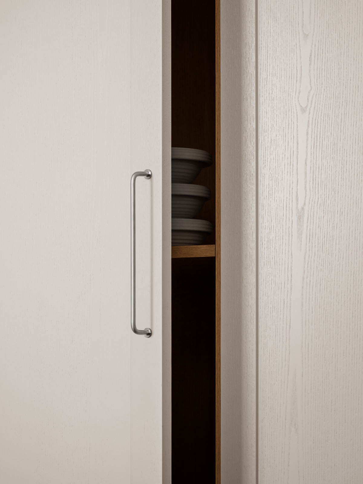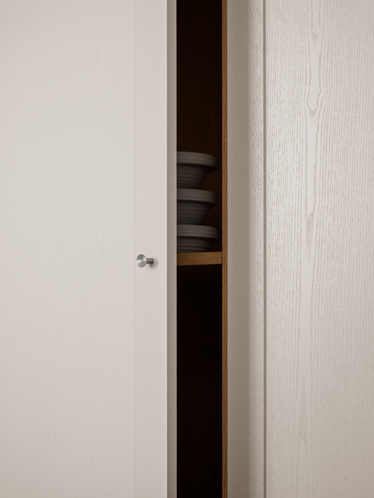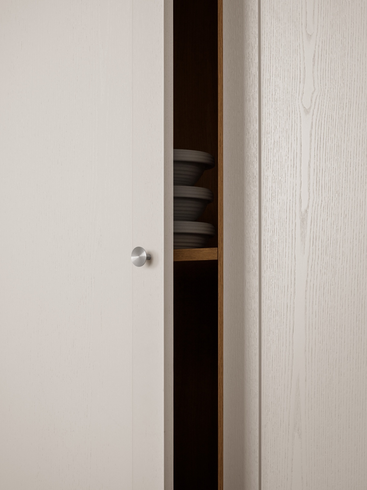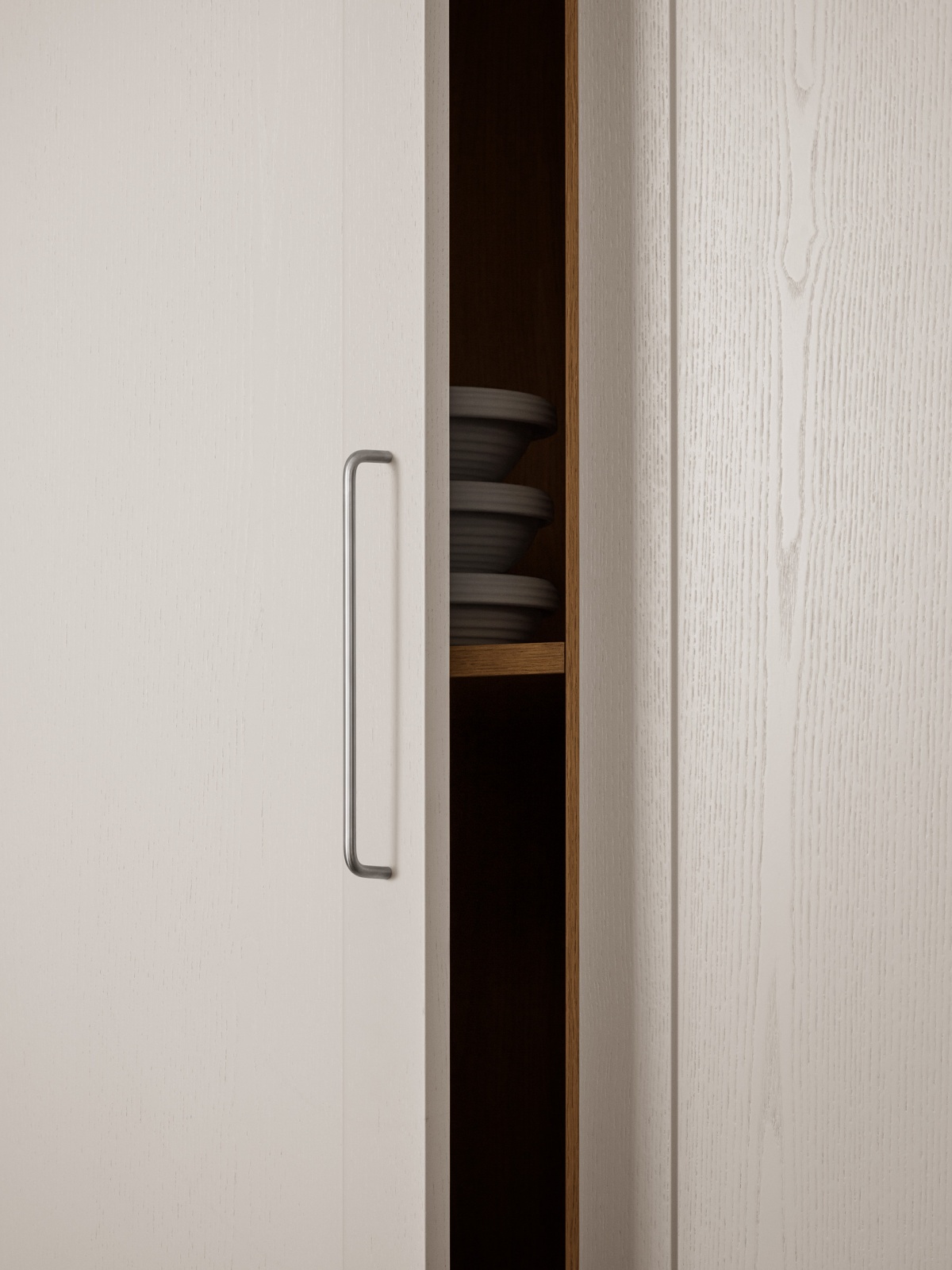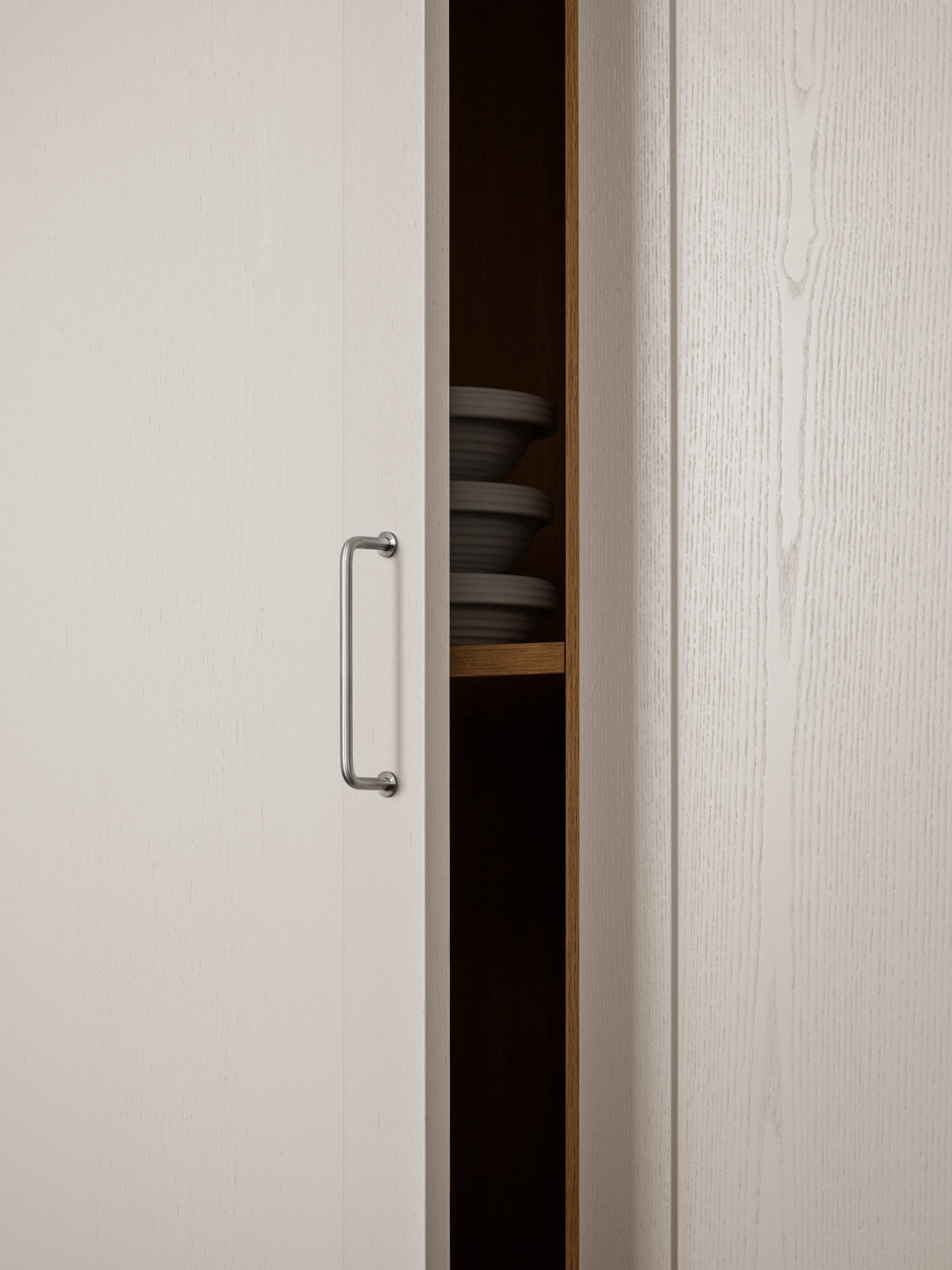 The collection is a nod to the Shaker movement and its sentiments of craft, simplicity and utility. An embossed frame on its front gestures to an iconic visual cue of the Shaker kitchen.