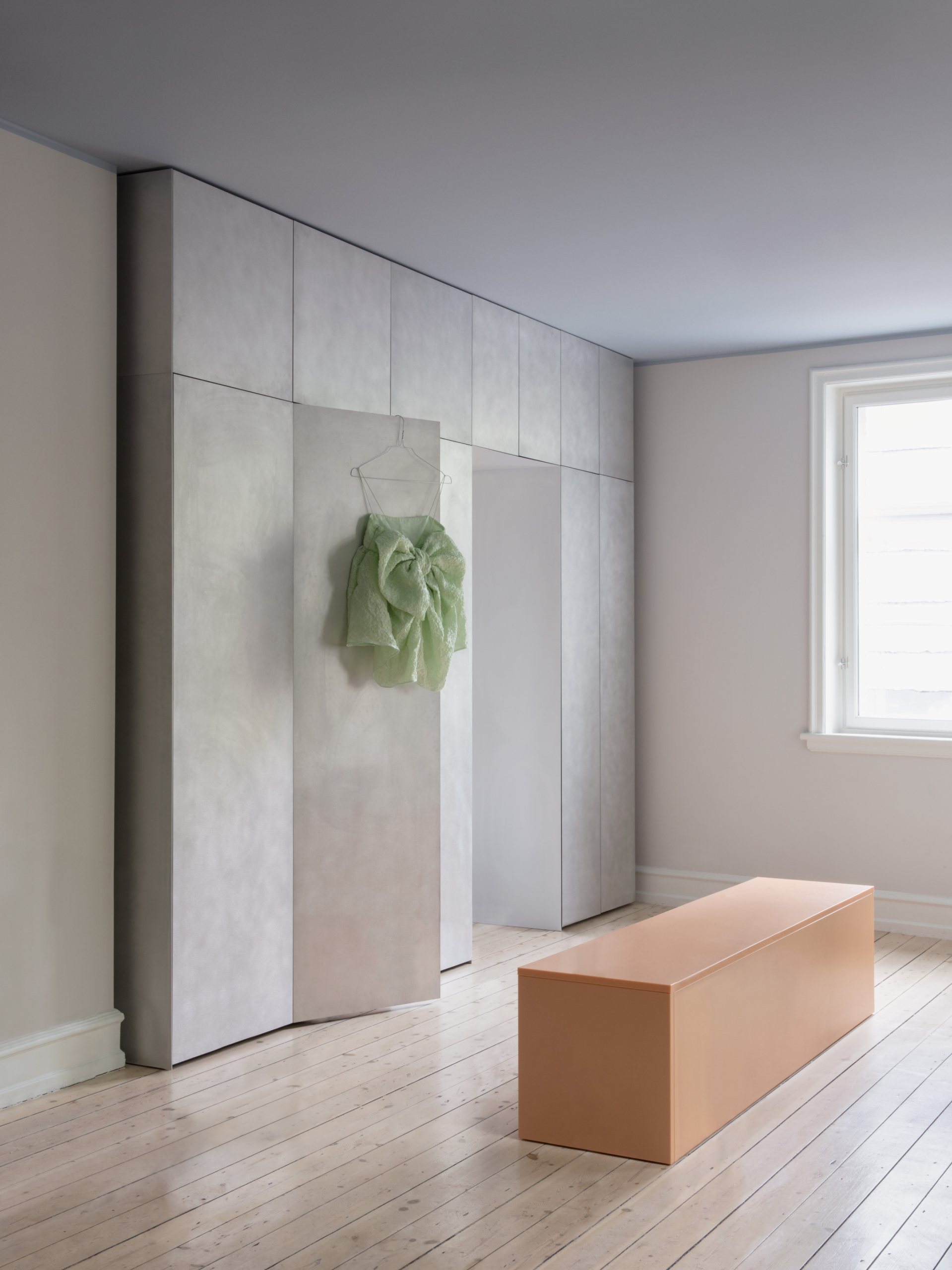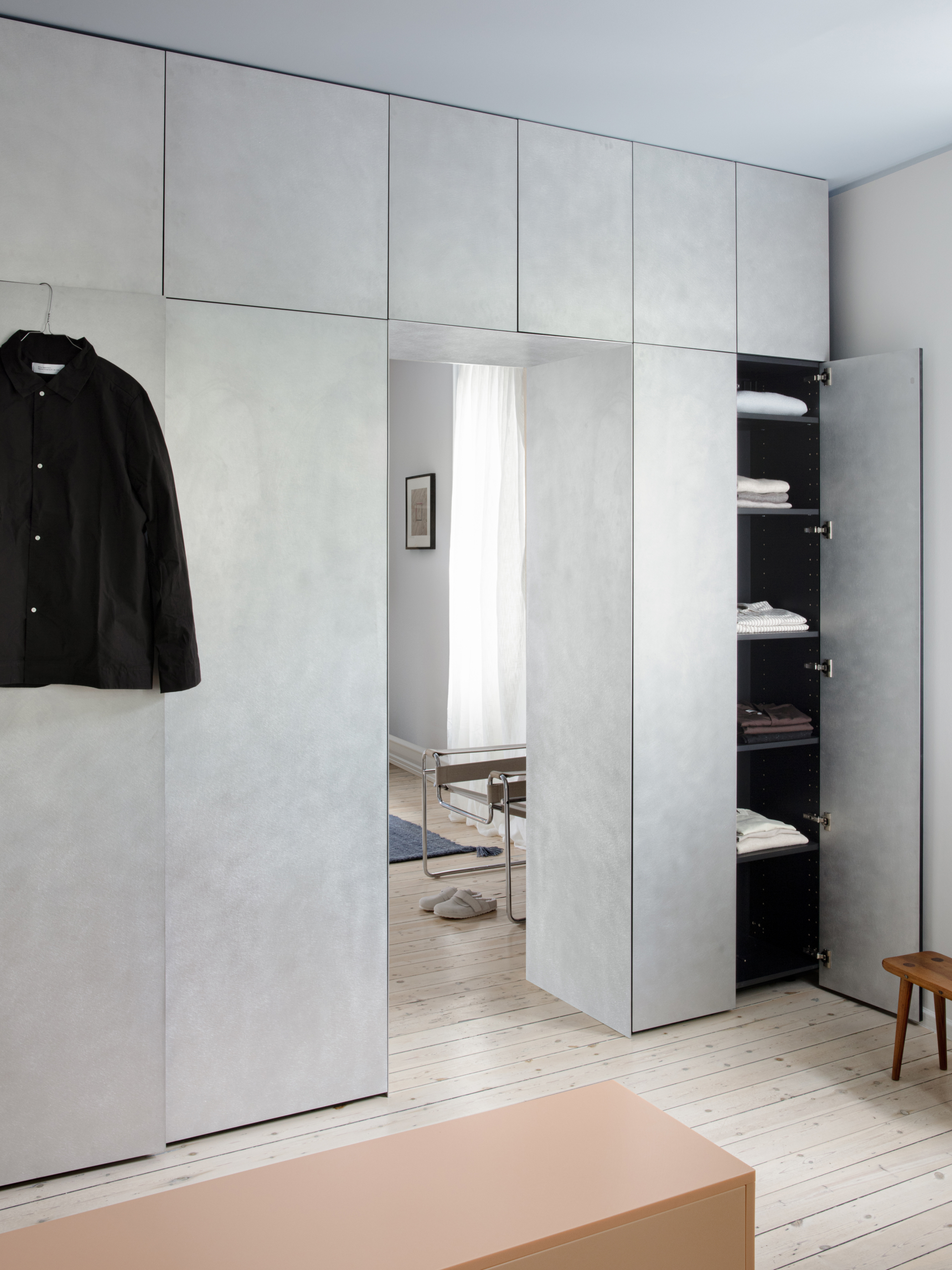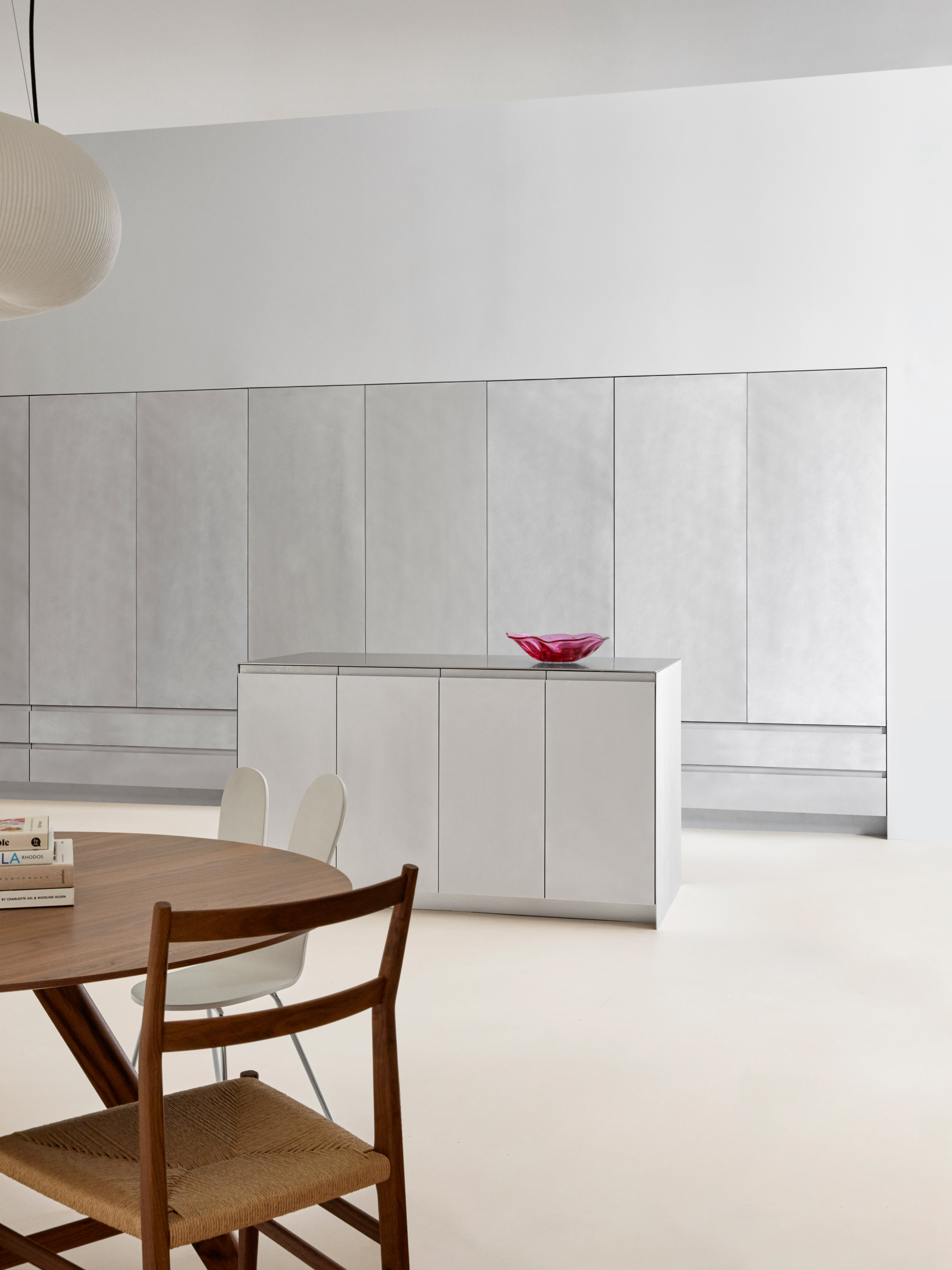 PLATE har integrerede greb formet af forskudte metalplader. Høje skabe åbnes med en push-to-open løsning.