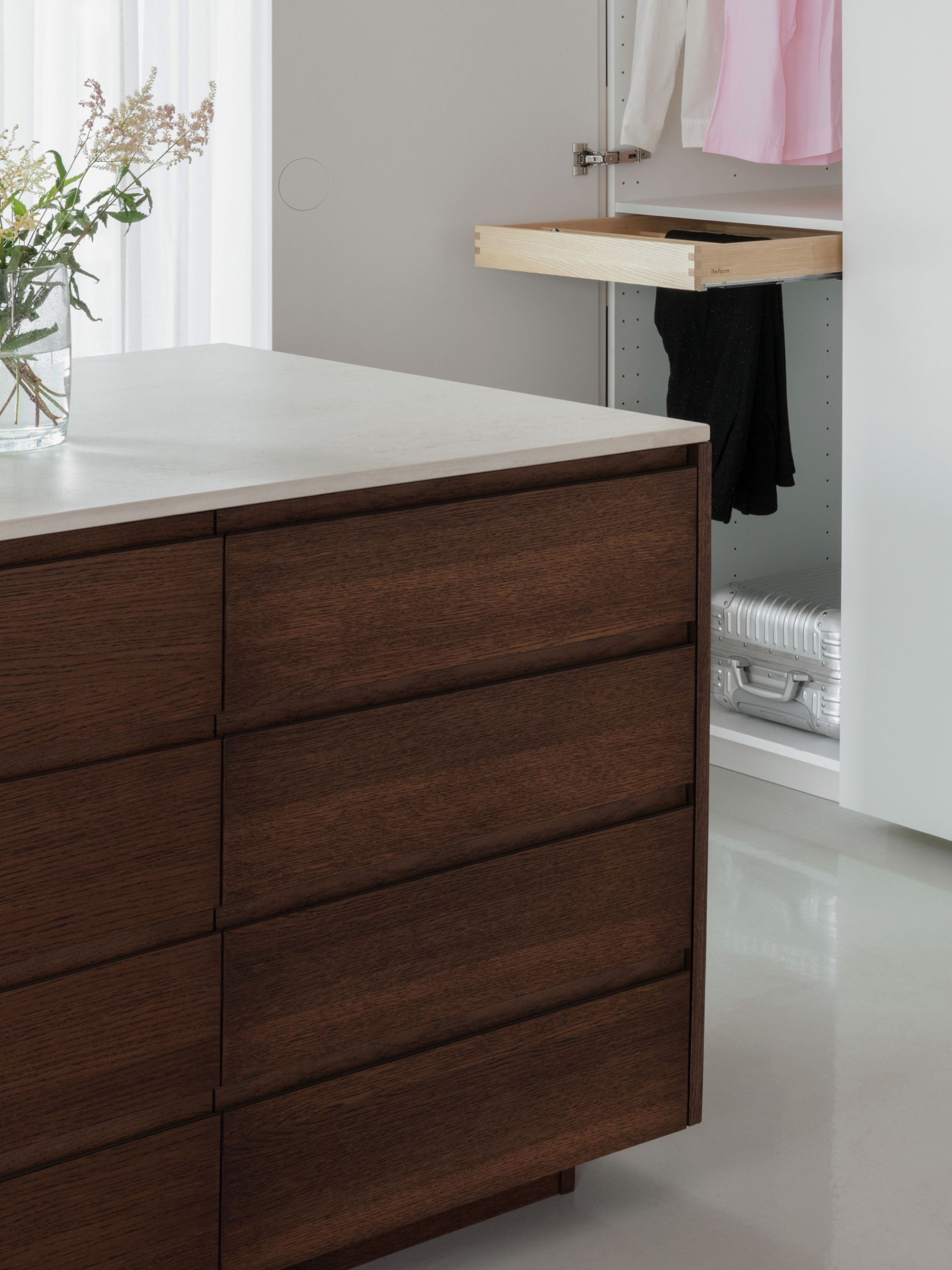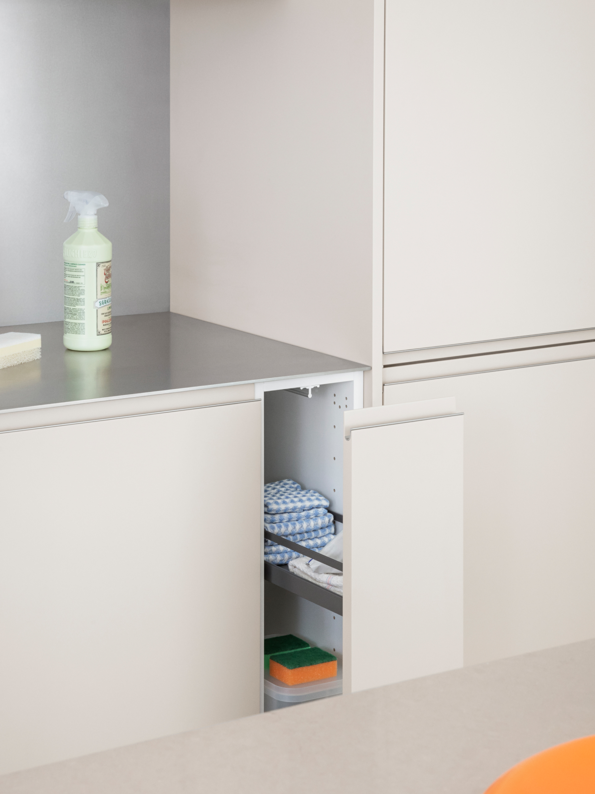 Den afrundede aluminiumsprofil fungerer som et diskret, integreret greb, der samler designet med bløde linjer og beskytter fronterne mod slid.