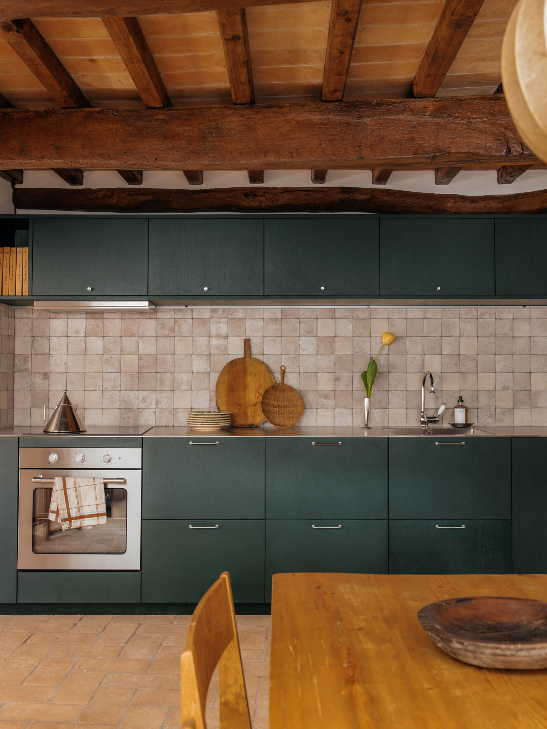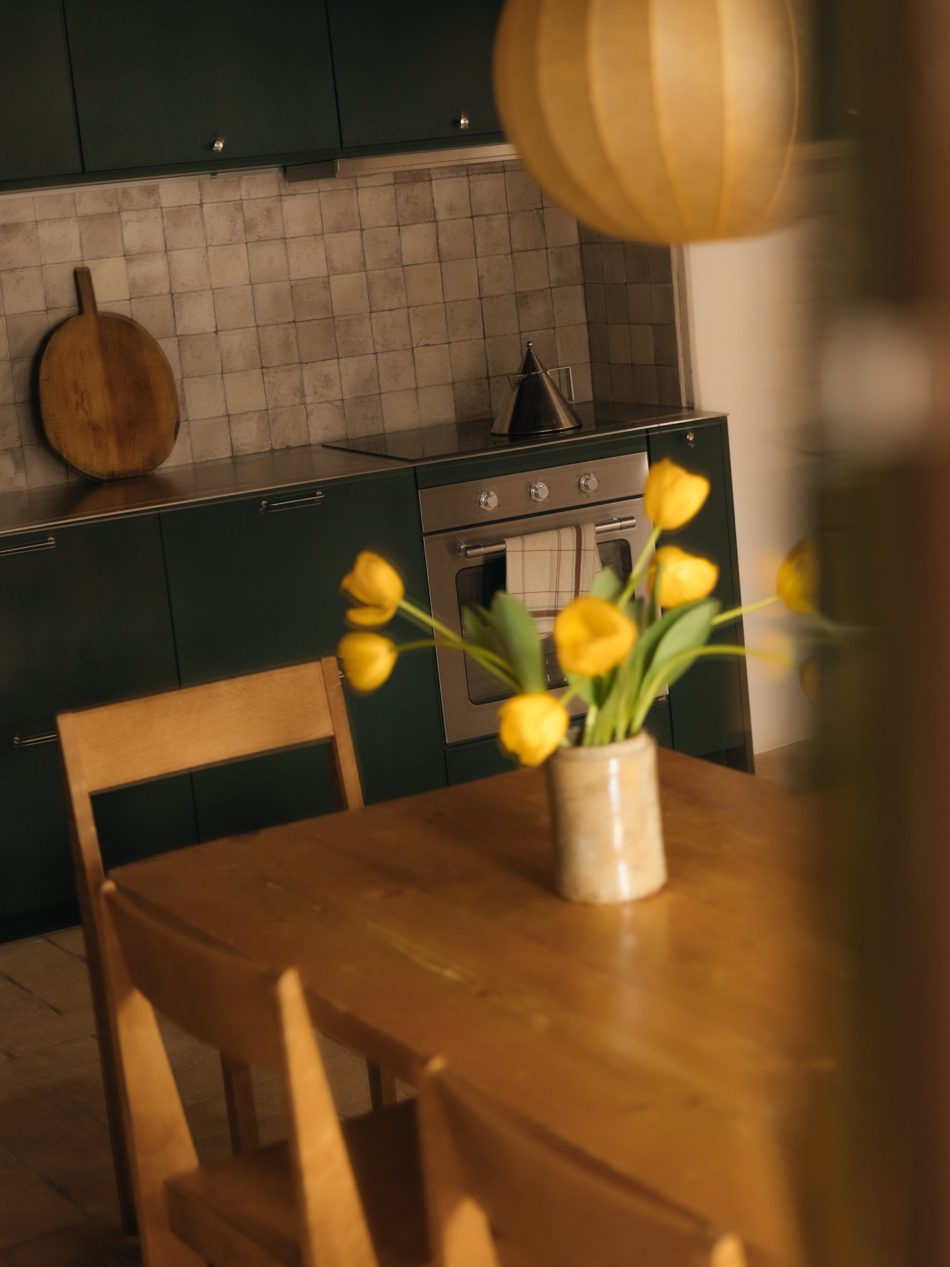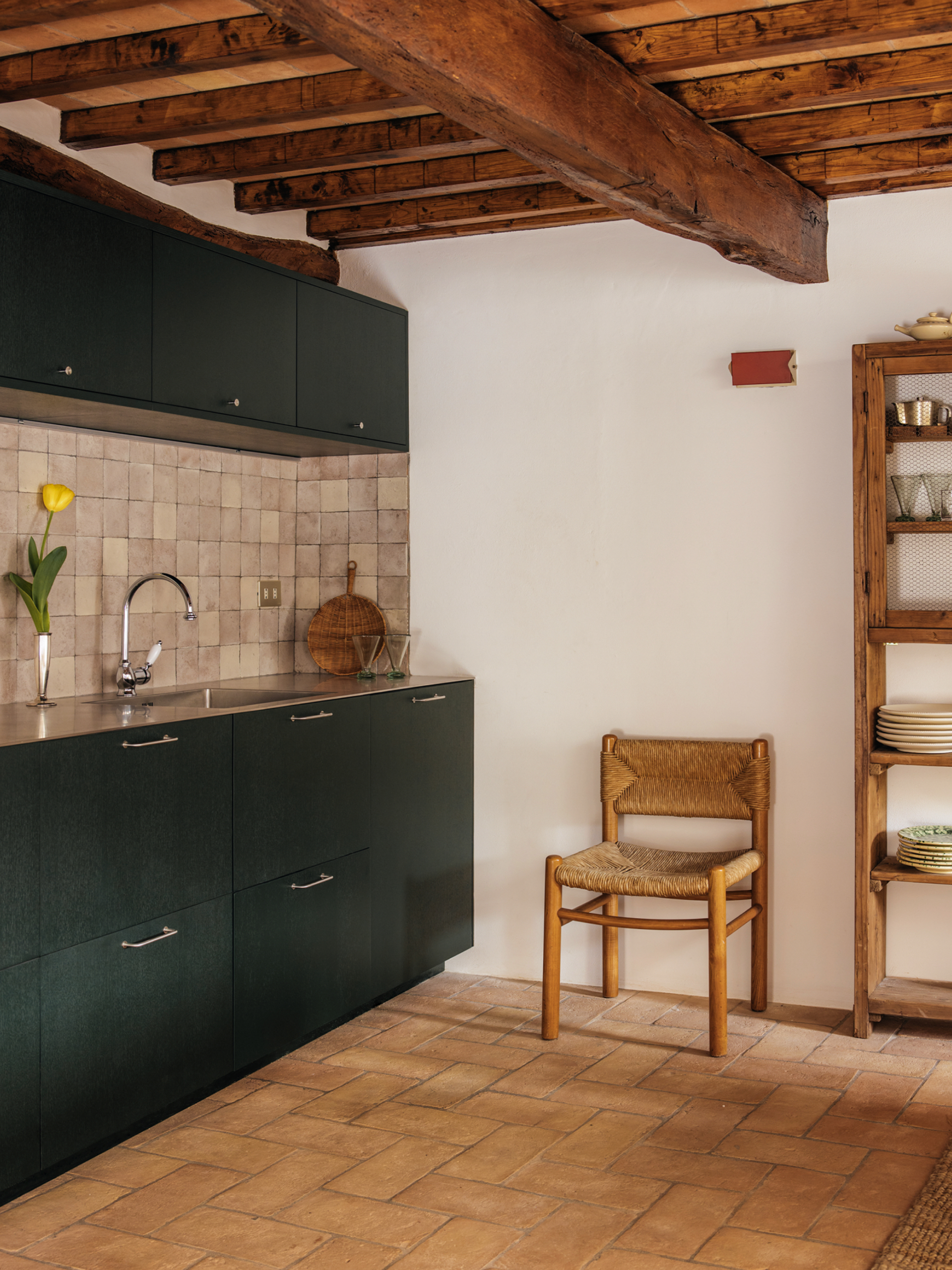 Most of Sam’s life at home revolves around the kitchen—a space for cooking, working, gathering, and conversation. When choosing a kitchen, he wanted something that would complement the home’s white, cream, and natural wood tones while also adding a moment of color. PLAIN in deep green offered a moment of color, while stainless steel countertops reflect and distribute the beautiful western light from an adjacent window. For Sam, the kitchen is more than just a room, it’s where meaningful connections happen, and where the rituals of everyday life are celebrated.