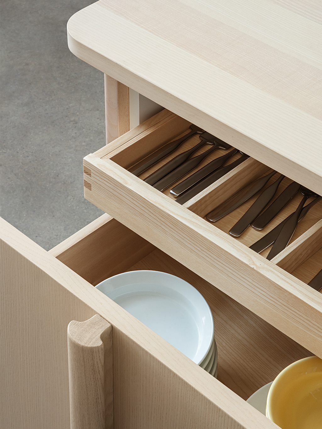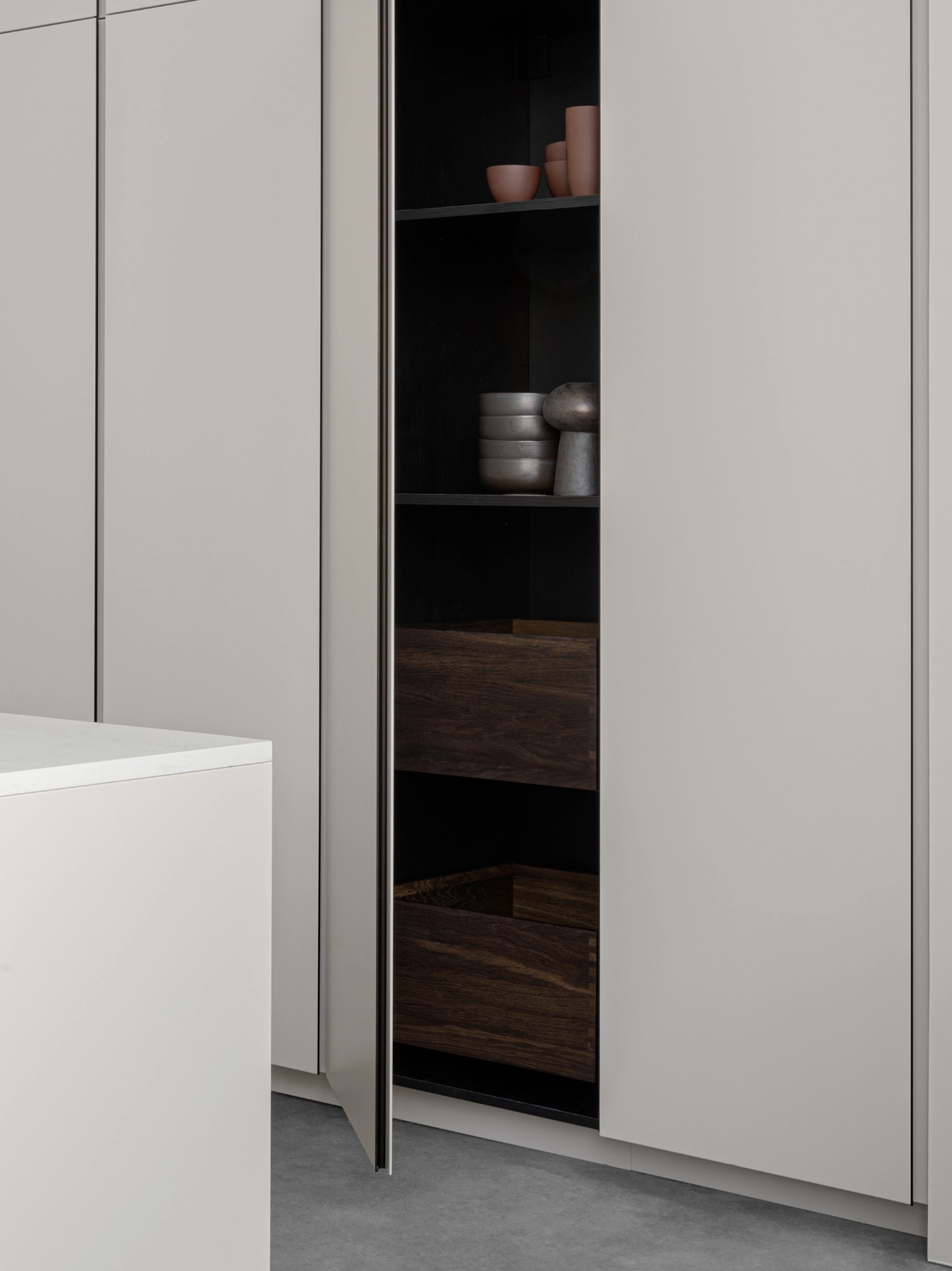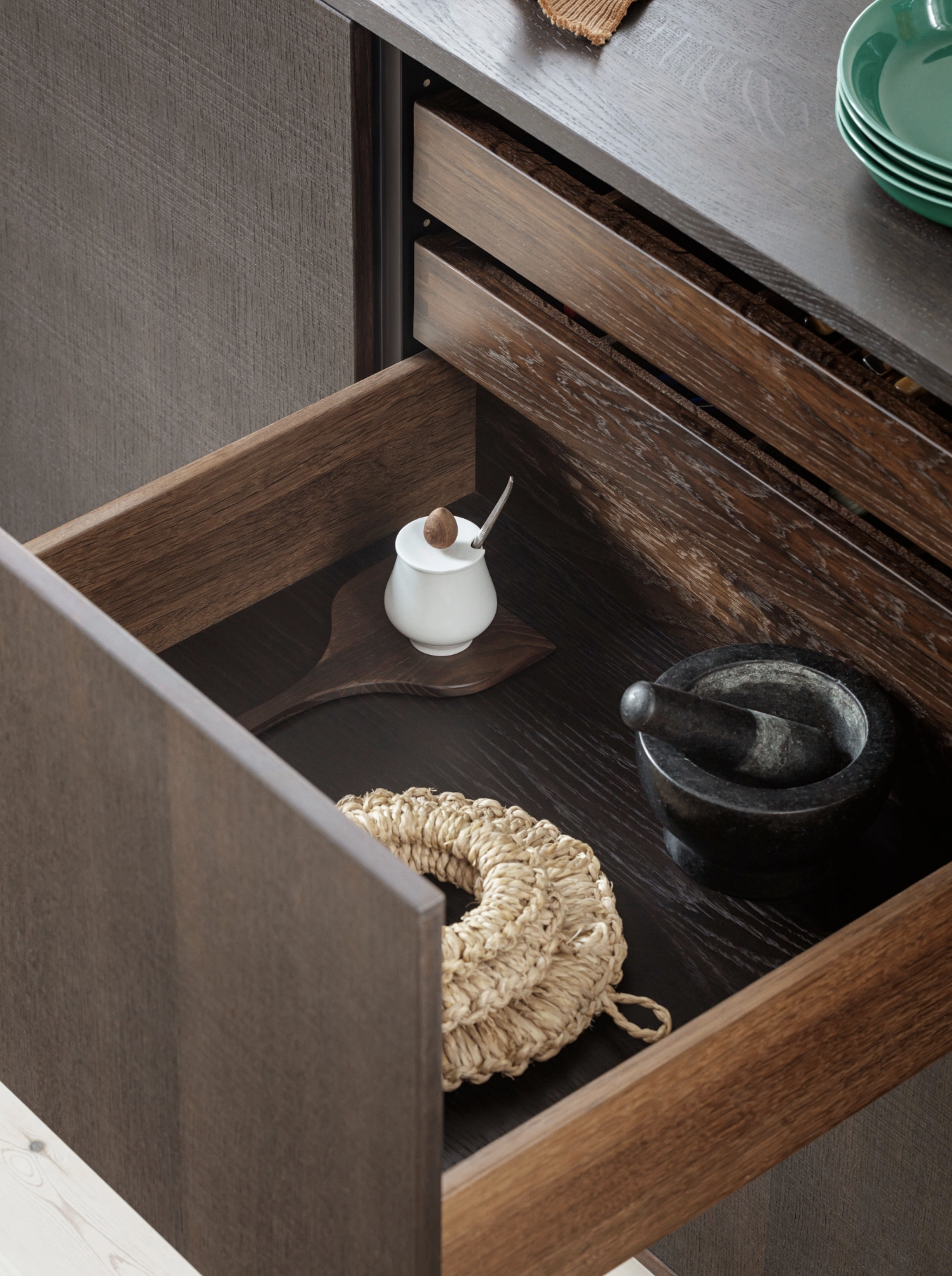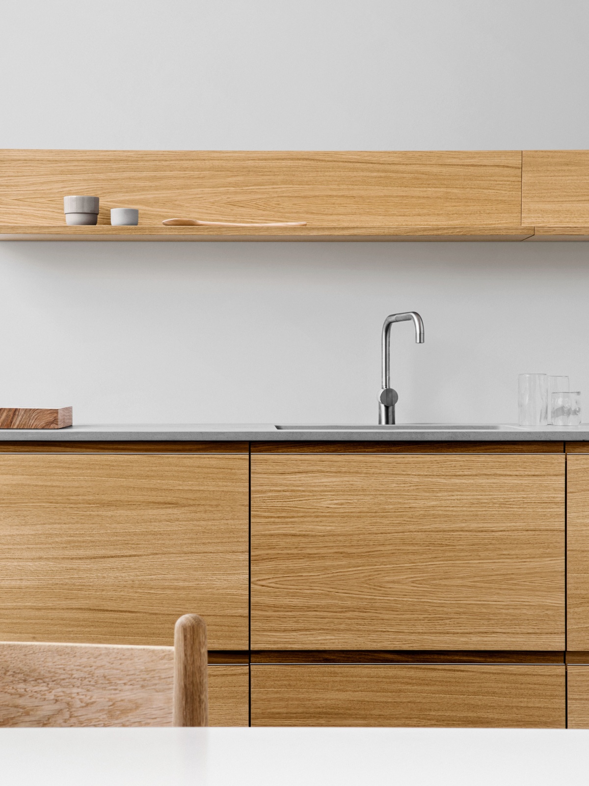 Enhance your kitchen’s functionality and design with carefully crafted wooden details. Features like solid oak drawers and organizers, or pairing your fronts with a solid wood countertop, add warmth and texture to your space while reinforcing its timeless appeal. These elements celebrate the natural beauty of wood, offering a tactile and refined finish that complements any kitchen style. Available in natural oak, smoked oak, and ash, these wooden accents can be tailored to match or contrast with your overall design.
