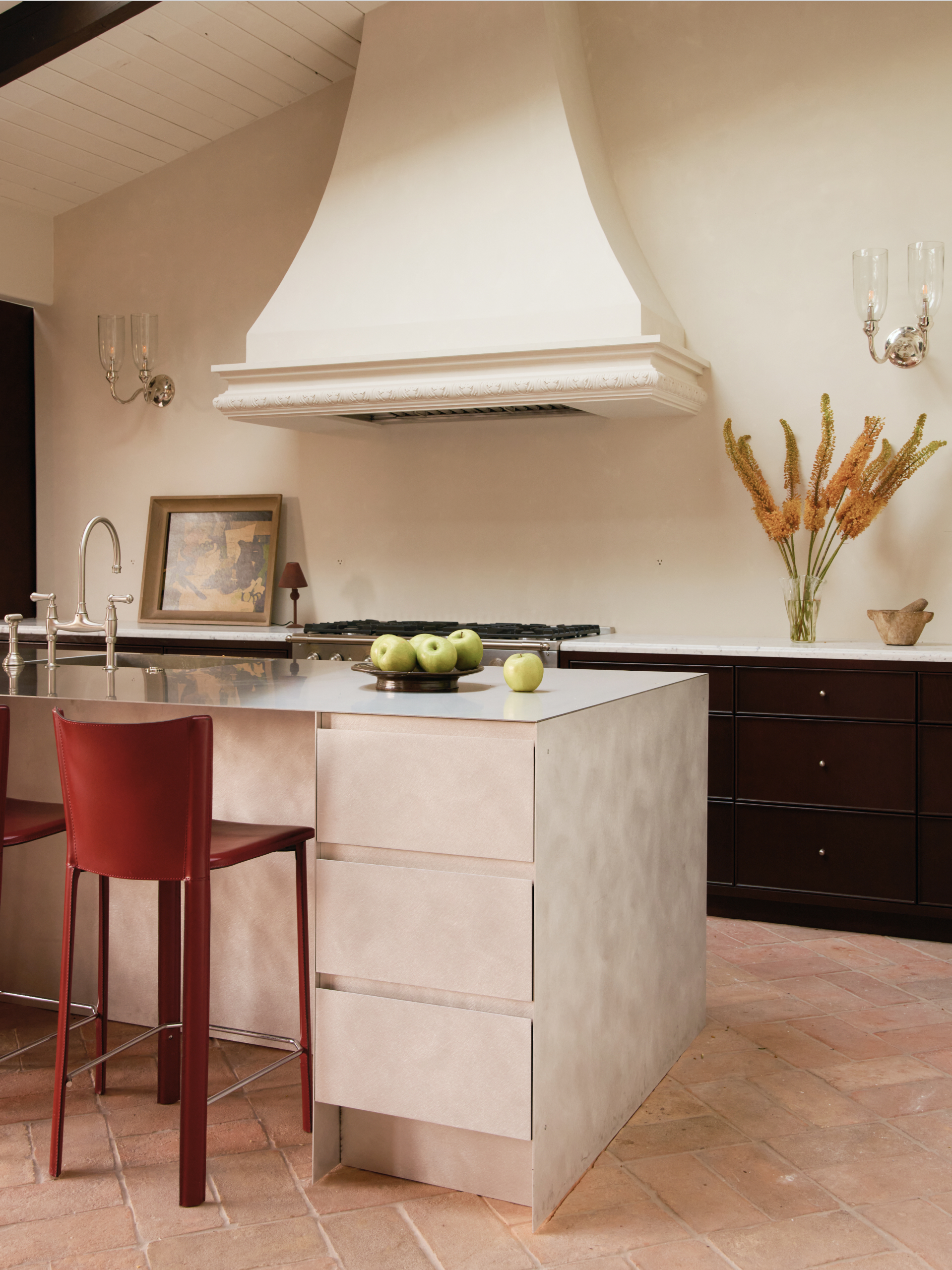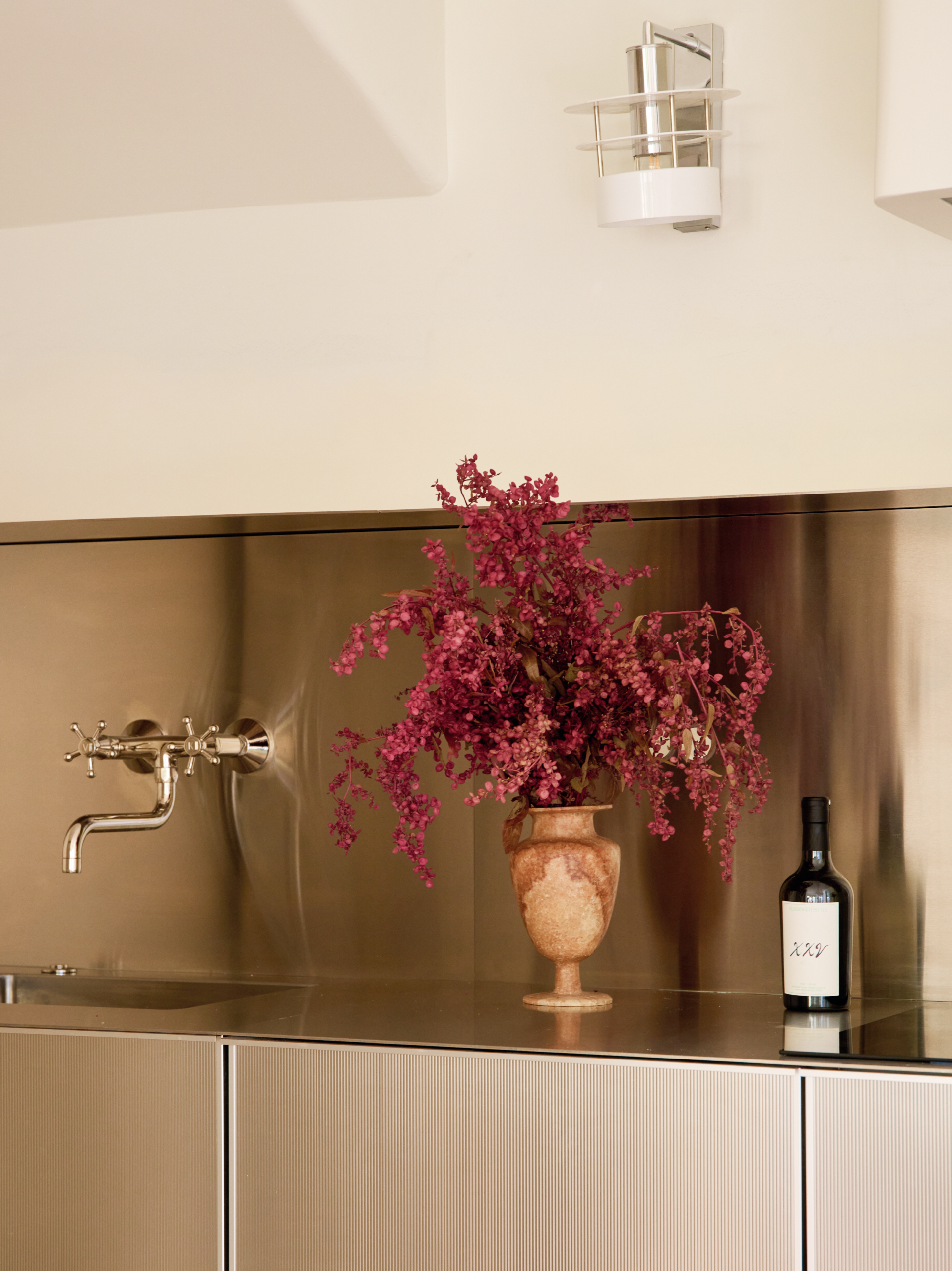The primary kitchen features PLATE with David Thulstrup. Its brushed stainless‑steel fronts introduce a precise, modern contrast to the warmth of wood, marble, and plaster, materials that echo the home’s original character. Within the ADU, REFLECT with Jean Nouvel shapes a compact kitchenette defined by light and texture. The ridged stainless steel captures and reflects daylight, while cork flooring softens the space. A salvaged window adds movement and character. Together, these elements create a tactile composition that balances function with a quiet sense of presence. Across XXV, every space is guided by a dialogue between old and new. The result is a thoughtful retreat within the city rooted in craftsmanship, shaped by materiality, and designed to feel both timeless and distinctly contemporary.
