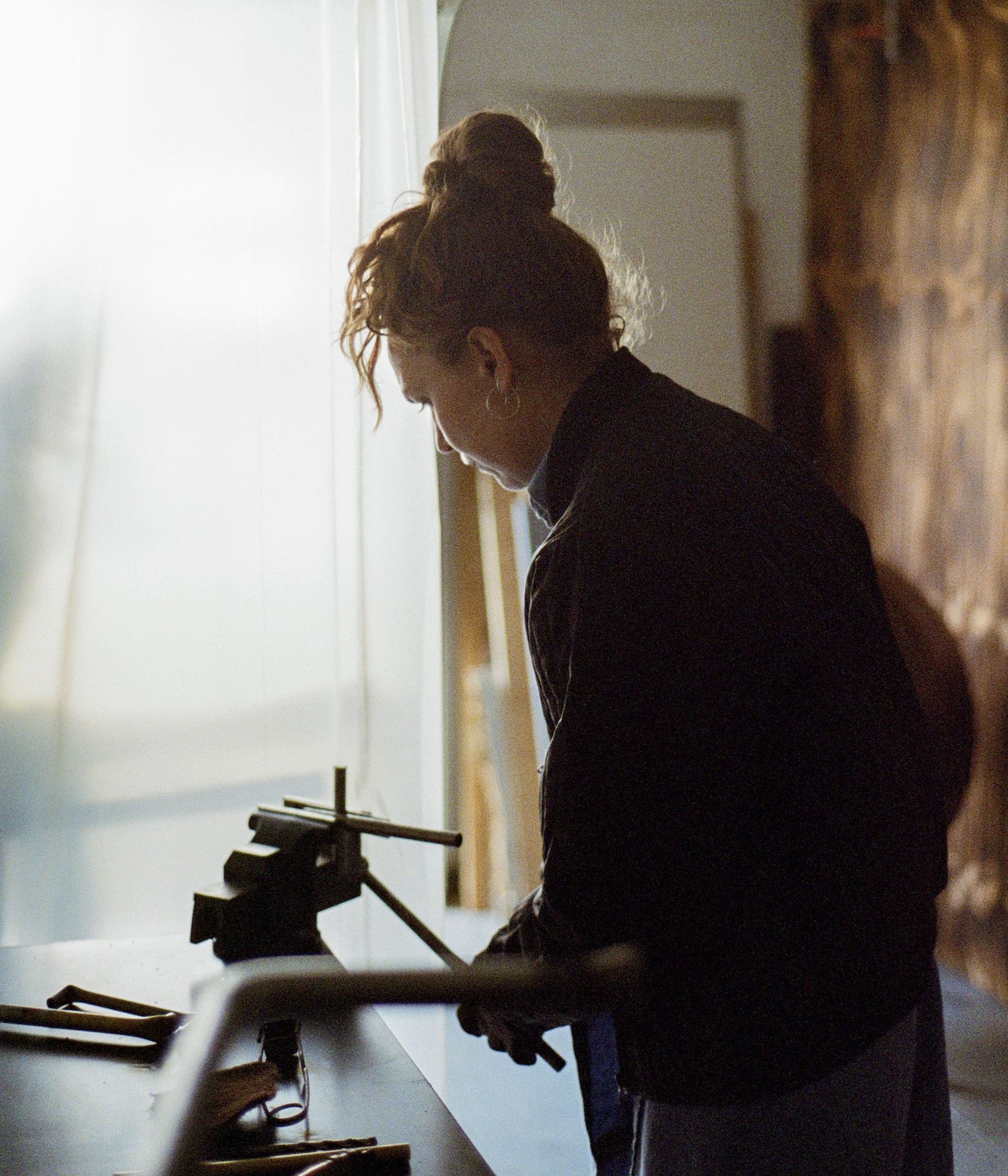 Die dänische Künstlerin und Metallbearbeiterin Alberte Tranberg hat einen feinen Sinn dafür, wie wir taktile Erfahrungen mit unserem gesamten Körper wahrnehmen und wie wir auf unsere Umwelt reagieren. Die in Philadelphia lebende Künstlerin schafft und entwickelt ihre Werke in der weitläufigen, rauen Umgebung ihrer Werkstatt. Tranbergs Wirken als Künstlerin entfaltet sich hauptsächlich in der Spannung zwischen Handwerkskunst und industrieller Fertigung. Ihre Arbeitsweise ist fest in einer tiefen Kenntnis der Metallverarbeitung verwurzelt, die es ihr erlaubt, die Regeln mit Selbstsicherheit zu brechen.