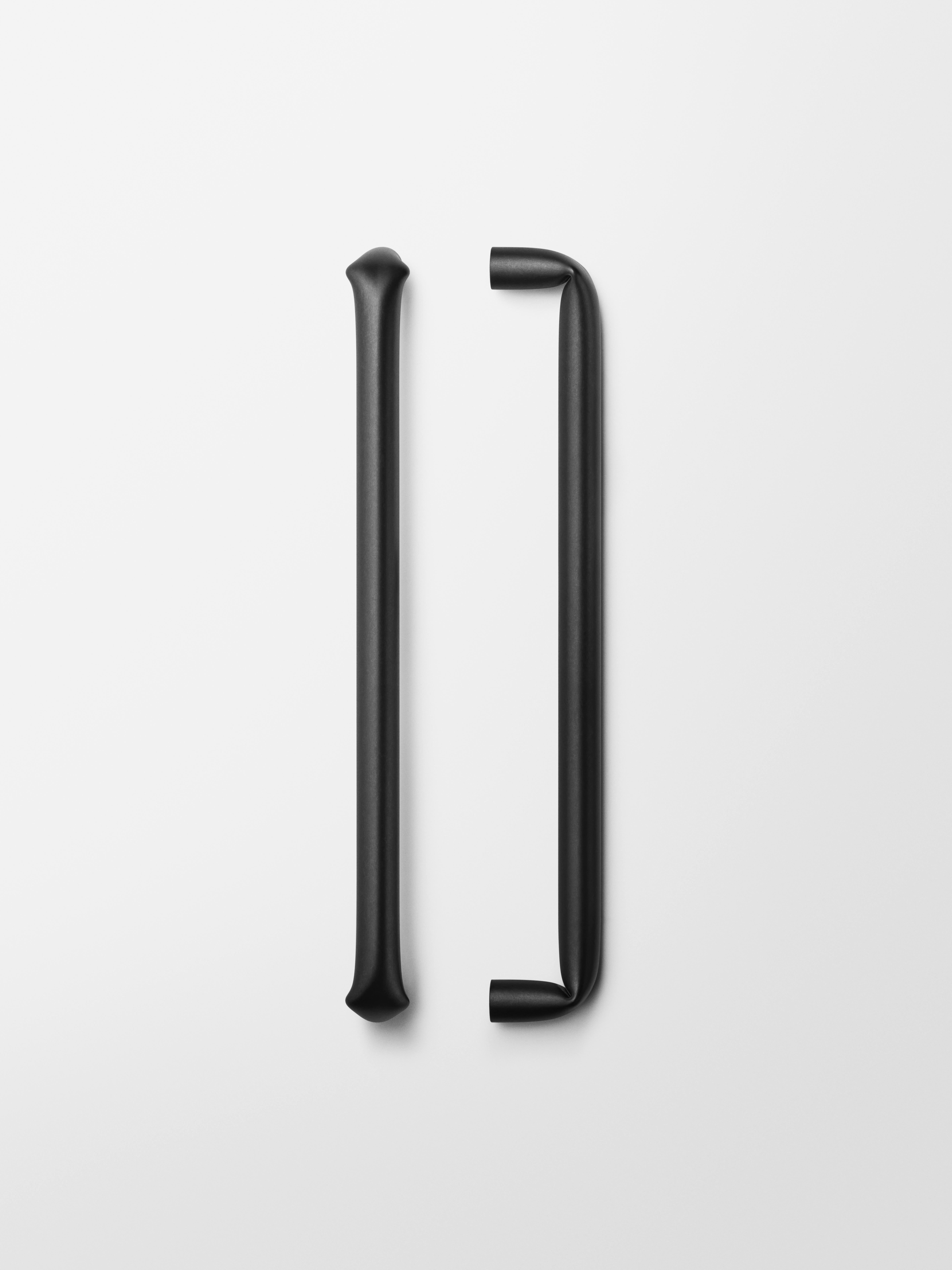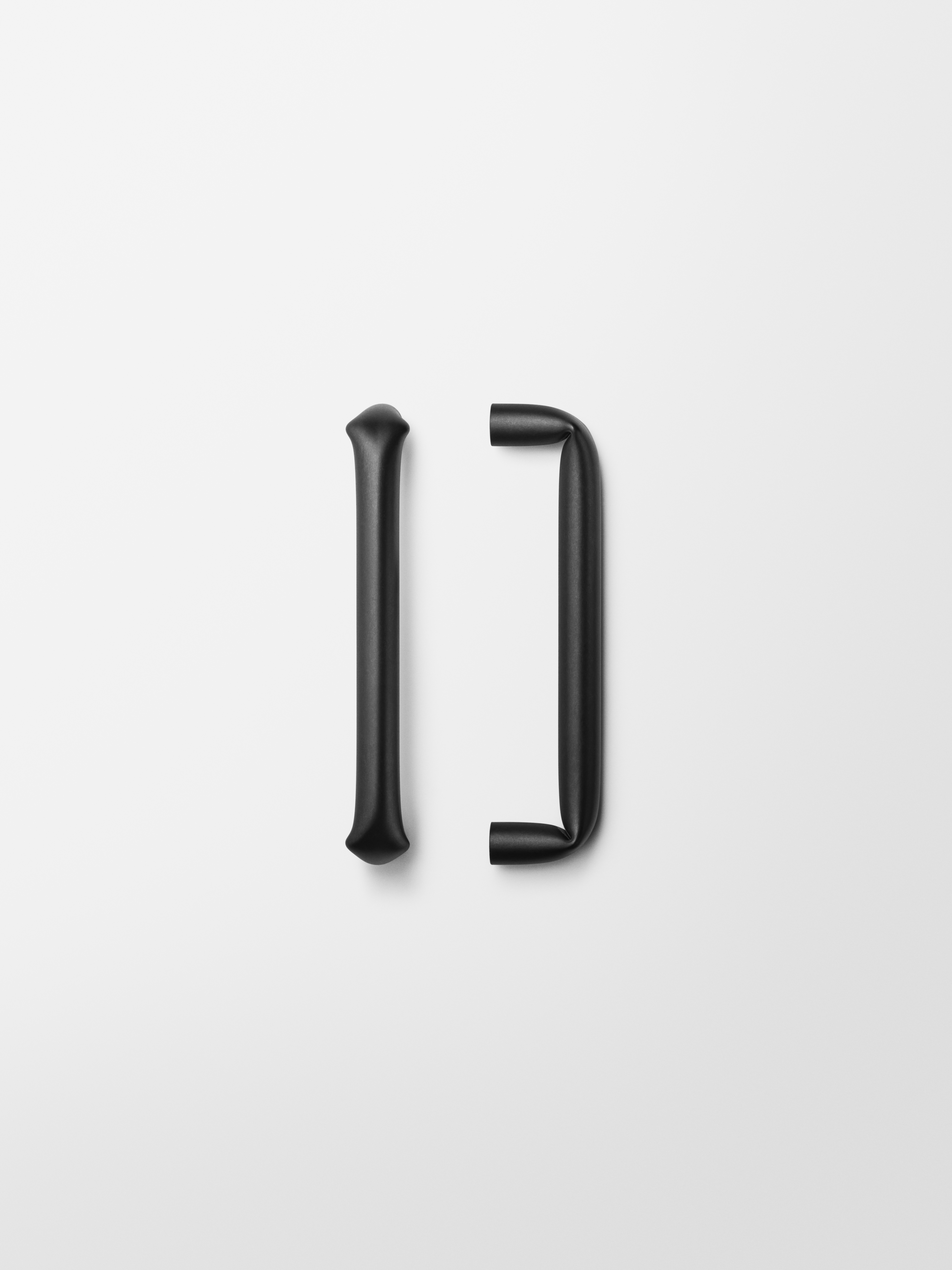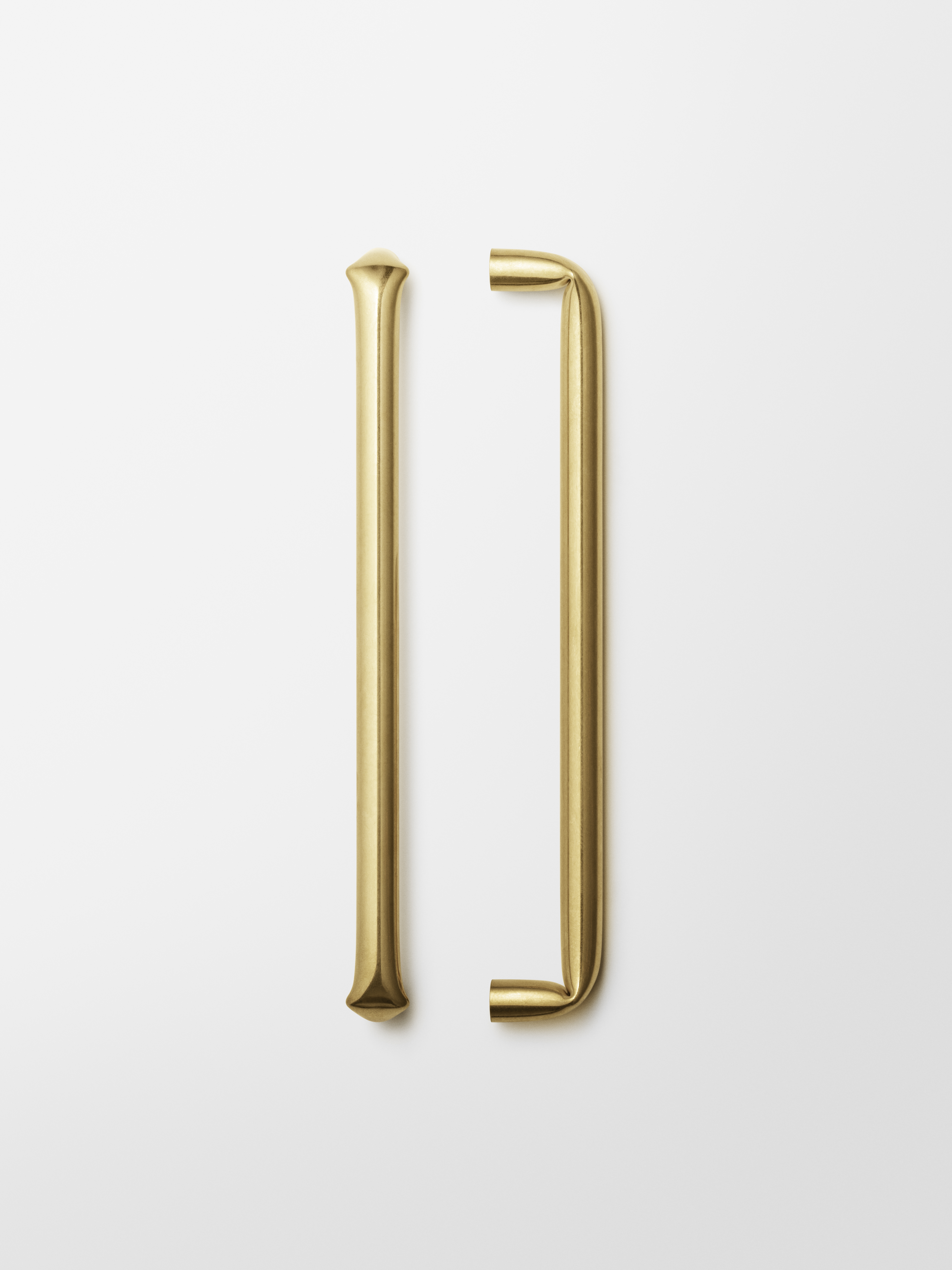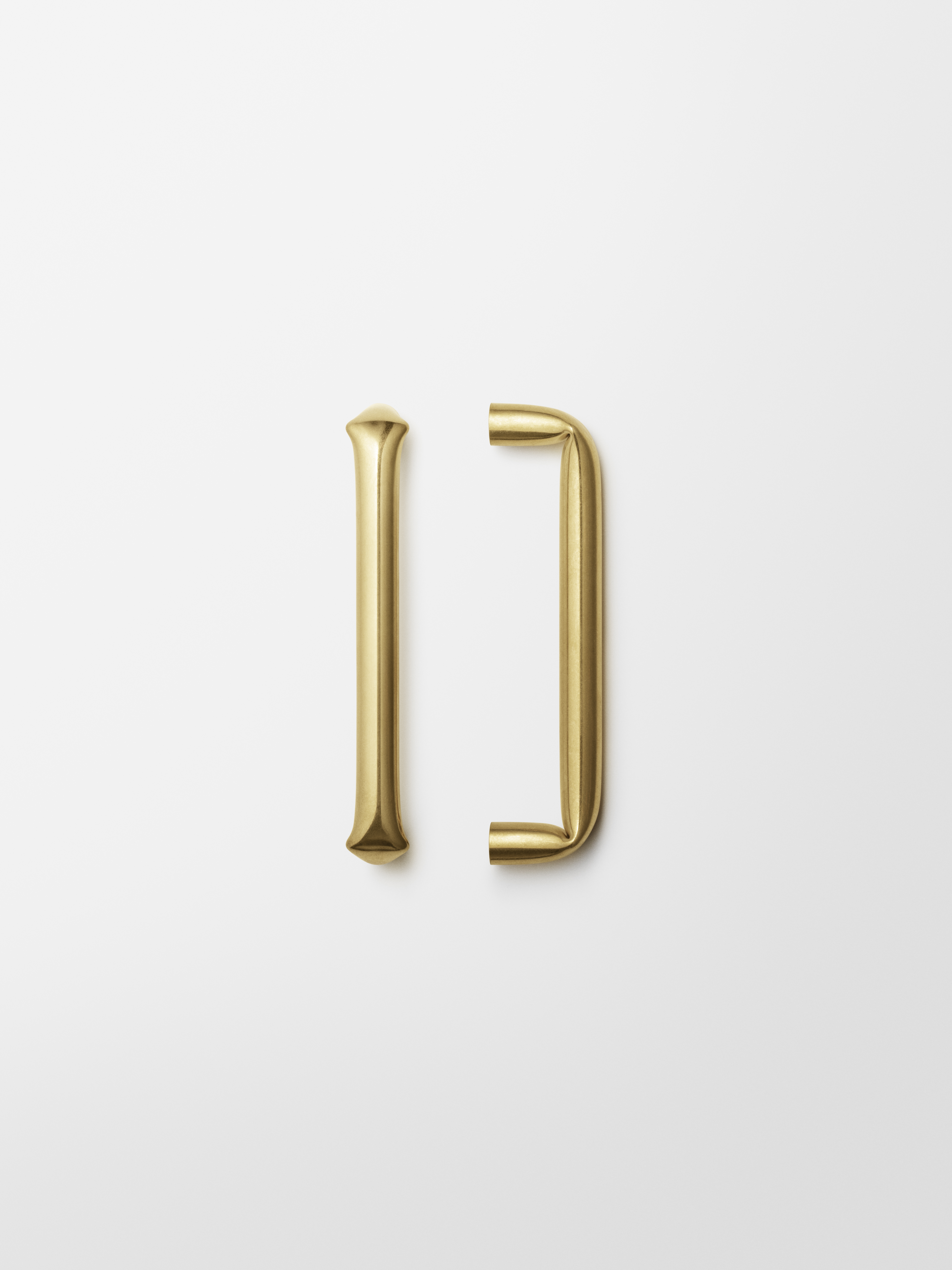 Die U-förmigen Metallgriffe von Alberte Tranberg gibt es in zwei Größen, die jeweils in zwei Varianten erhältlich sind: rohem Messing oder oxidiertem Messing. Beide Griffe sind aus einem Zylinder aus rohem Messing mit einem Außendurchmesser von 13 mm und einer Länge von 128 mm oder 224 mm gefertigt. Die Griffe sind mit den Kollektionen PLAIN und SHAKER kompatibel.
