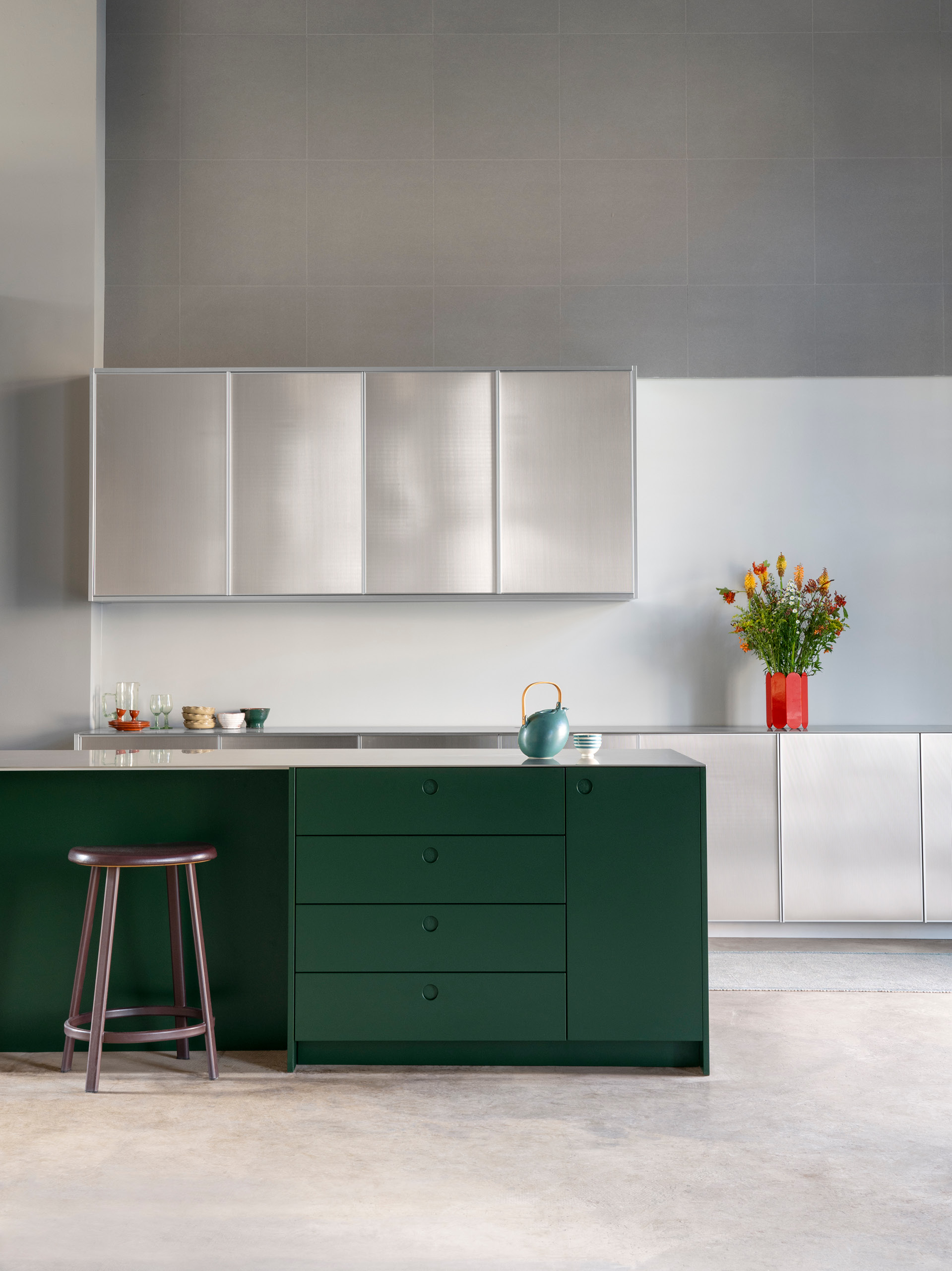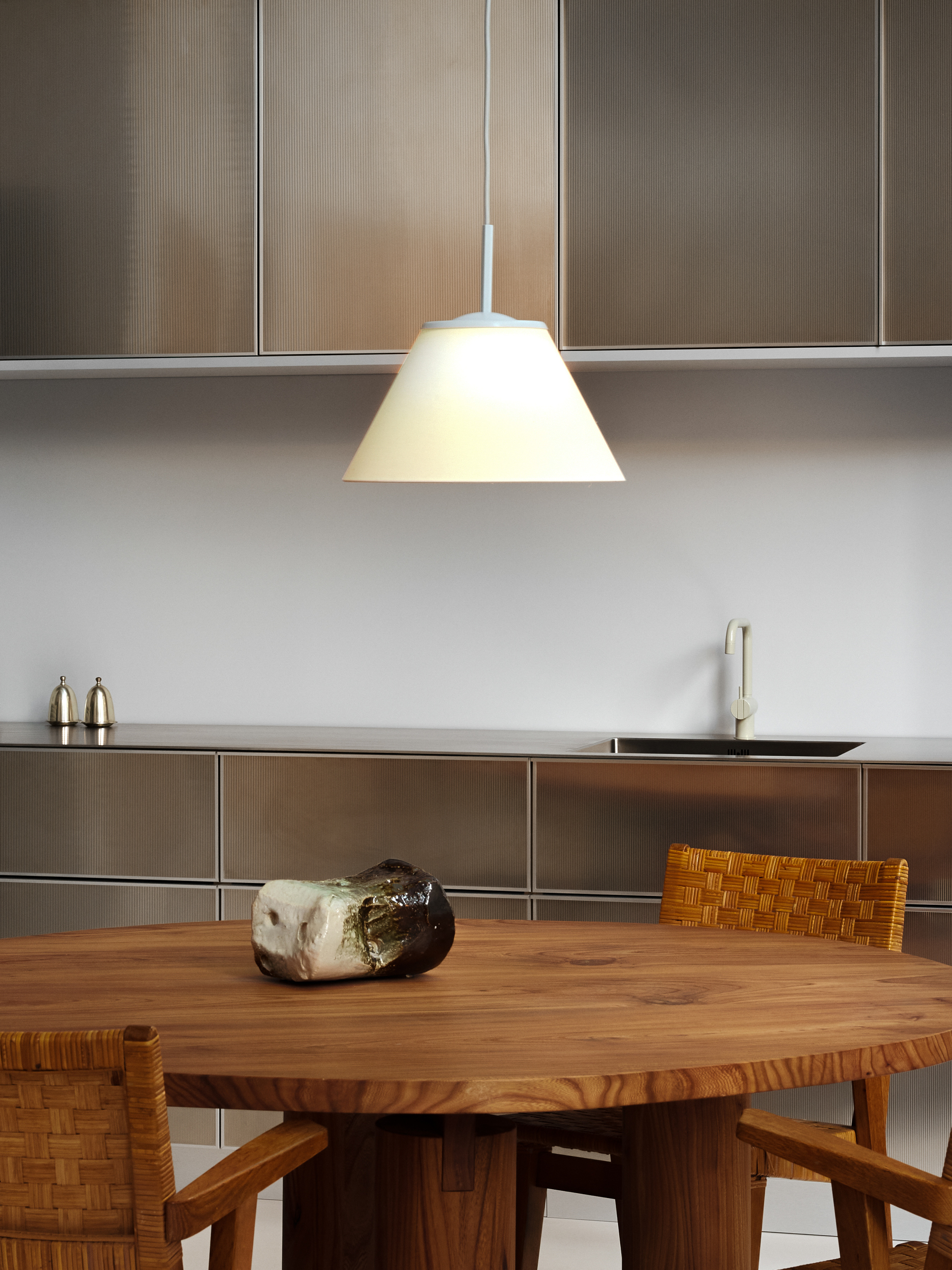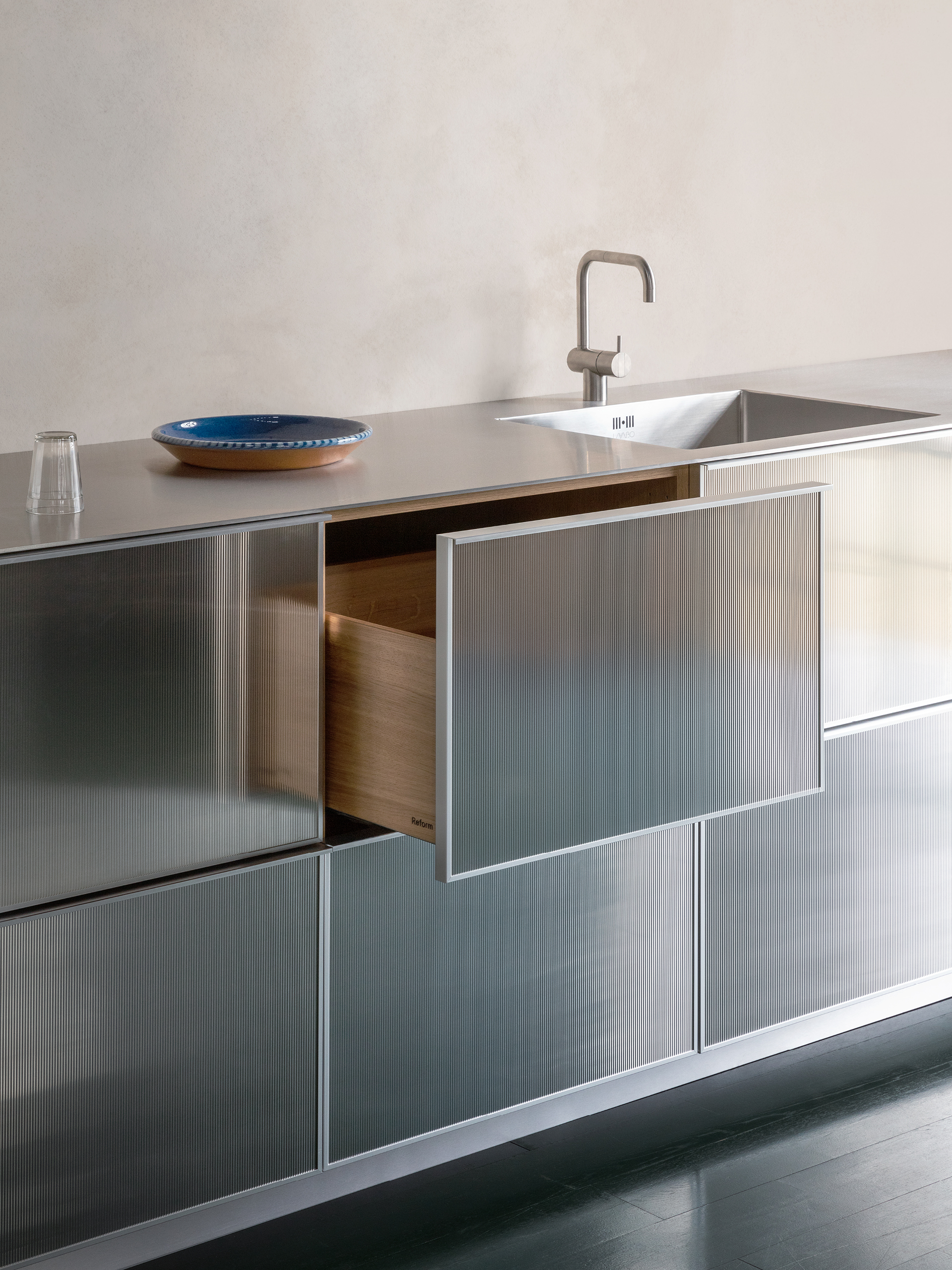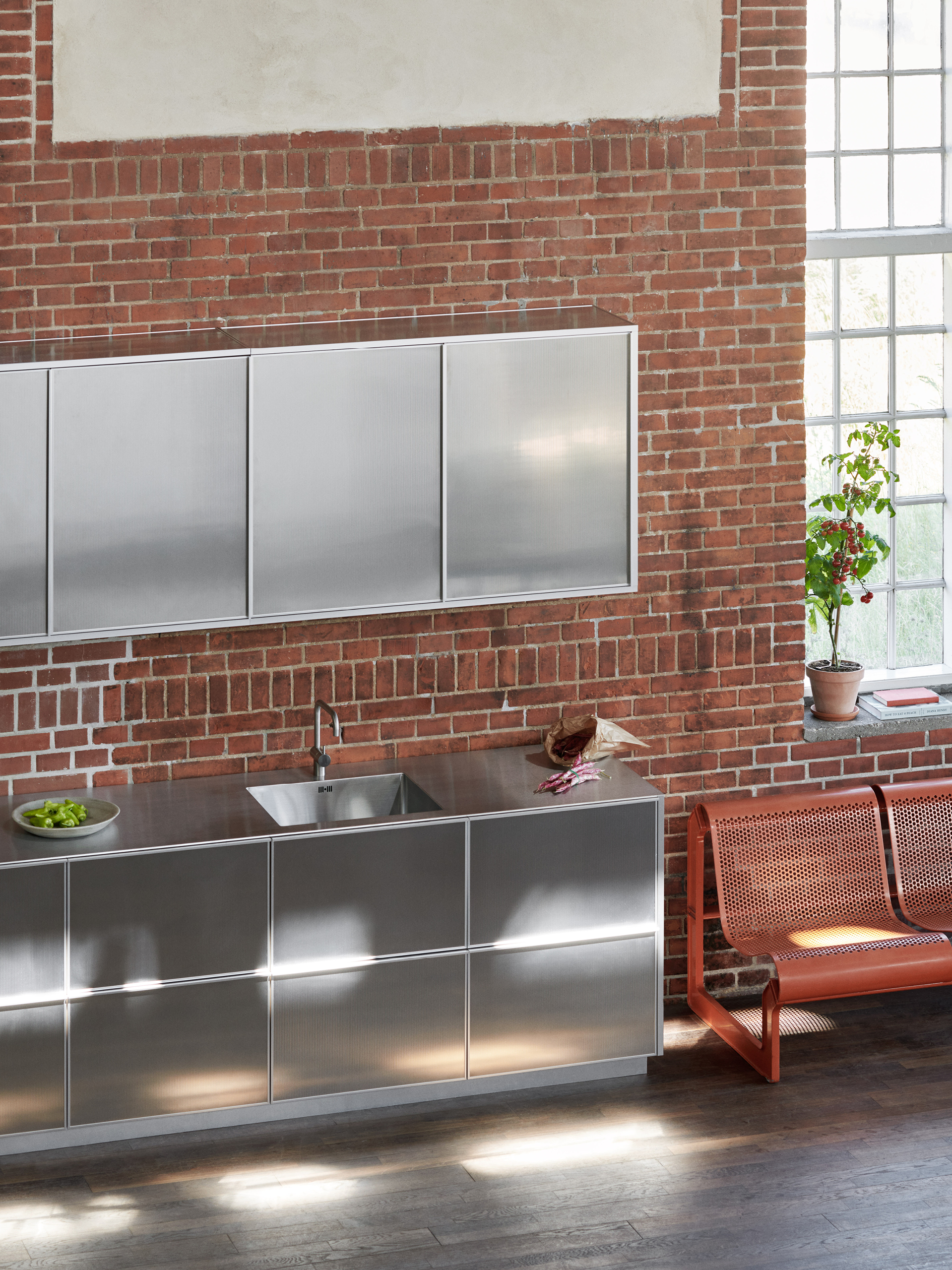 REFLECT explores the relationship between surface, structure, and light. Vertical ridges in brushed metal catch and shift with the daylight, creating quiet movement and evolving reflections. The result is a design that feels both grounded and dynamic—an expressive backdrop to everyday life.