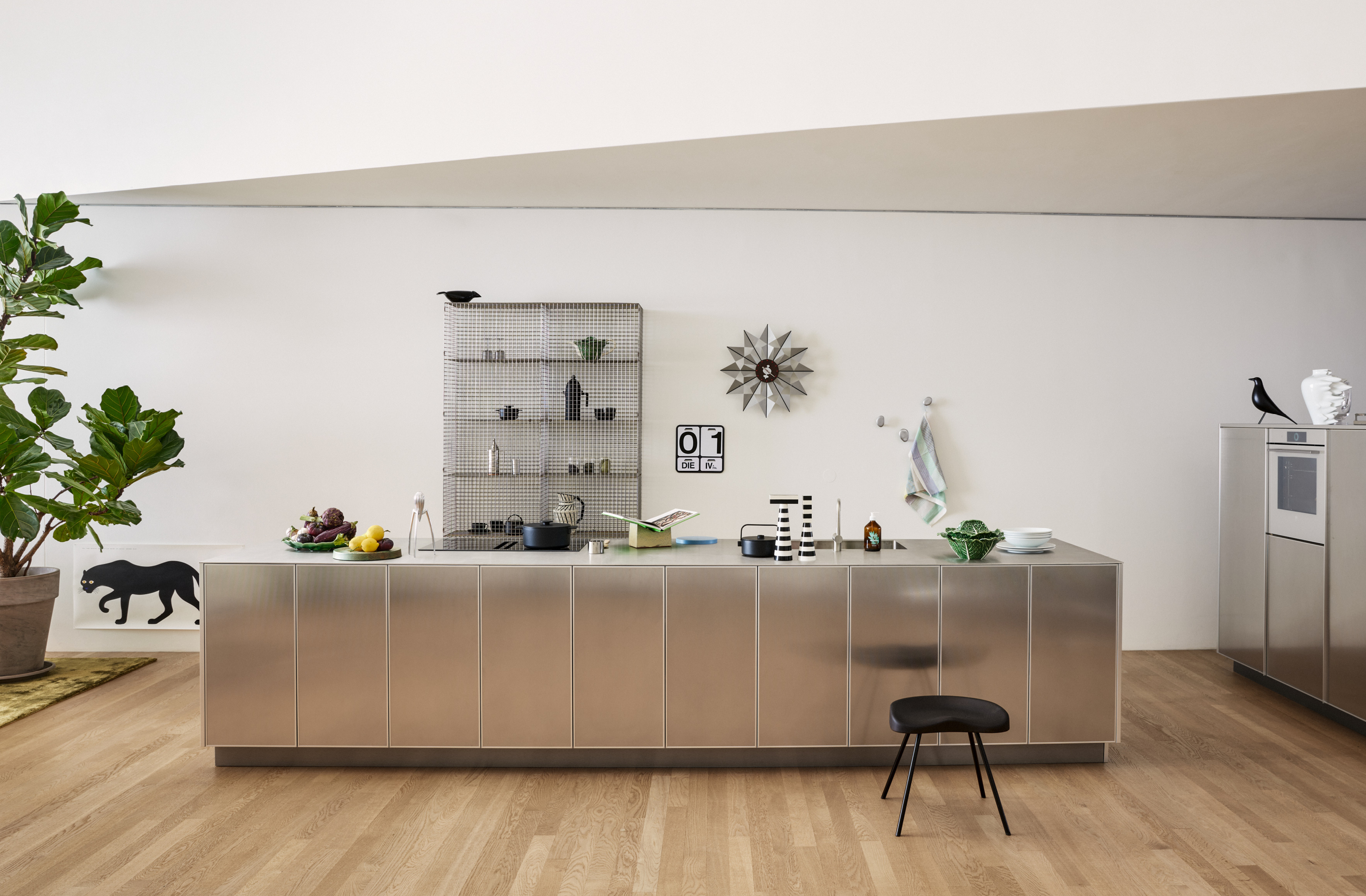 At VitraHaus, Reform’s REFLECT kitchen is featured as part of an evolving installation that explores the art of contemporary living. Designed to blur the boundaries between function and form, the space presents a curated vision of the modern home—combining furniture, objects, and architecture in a thoughtful dialogue. Within the kitchen area, REFLECT stands as a statement, showcasing Nouvel’s talent for conceptualizing light through materials as the kitchen’s reflective surface in stainless steel subtly interacts with the surroundings, creating a constantly changing visual expression.