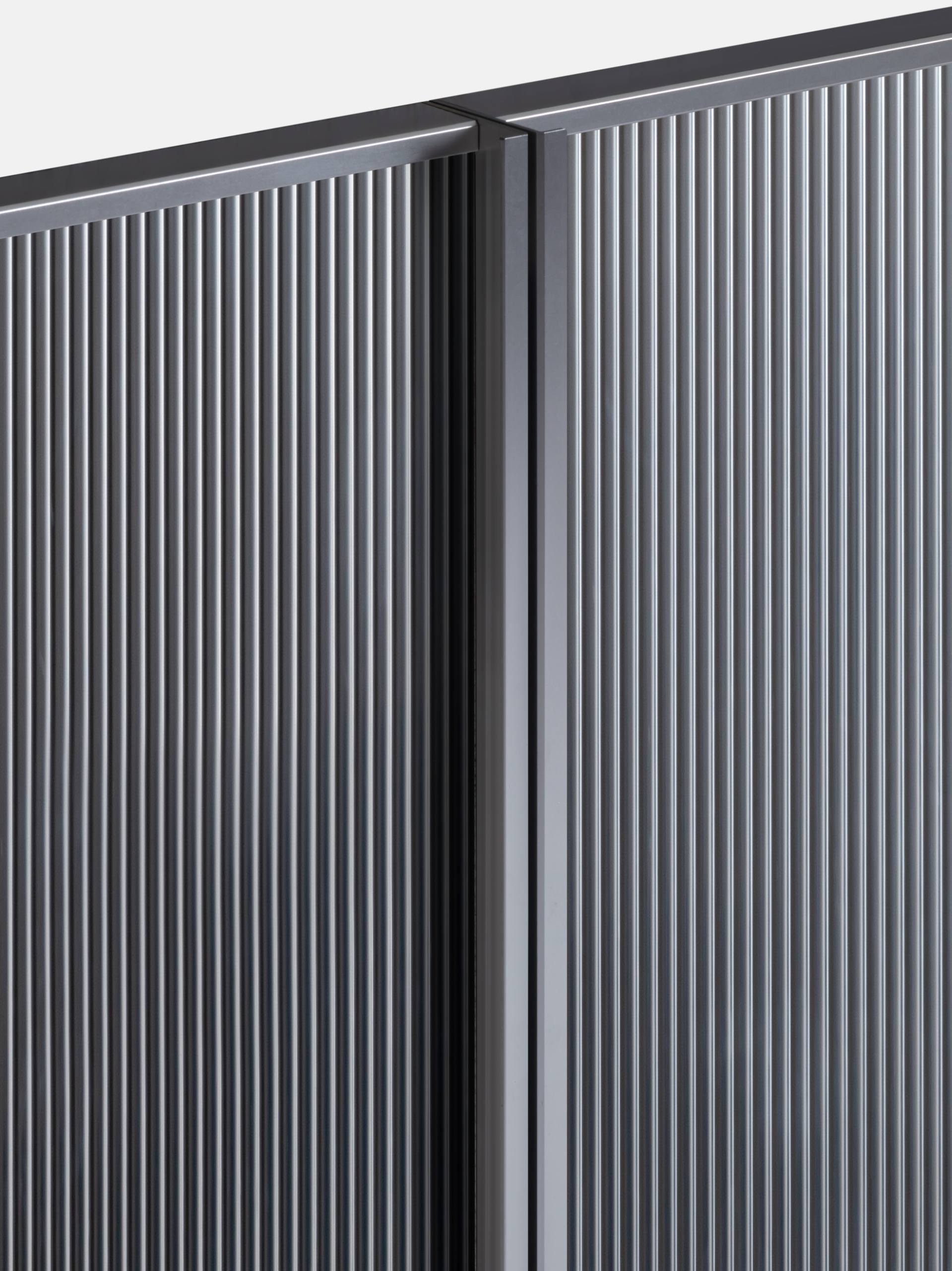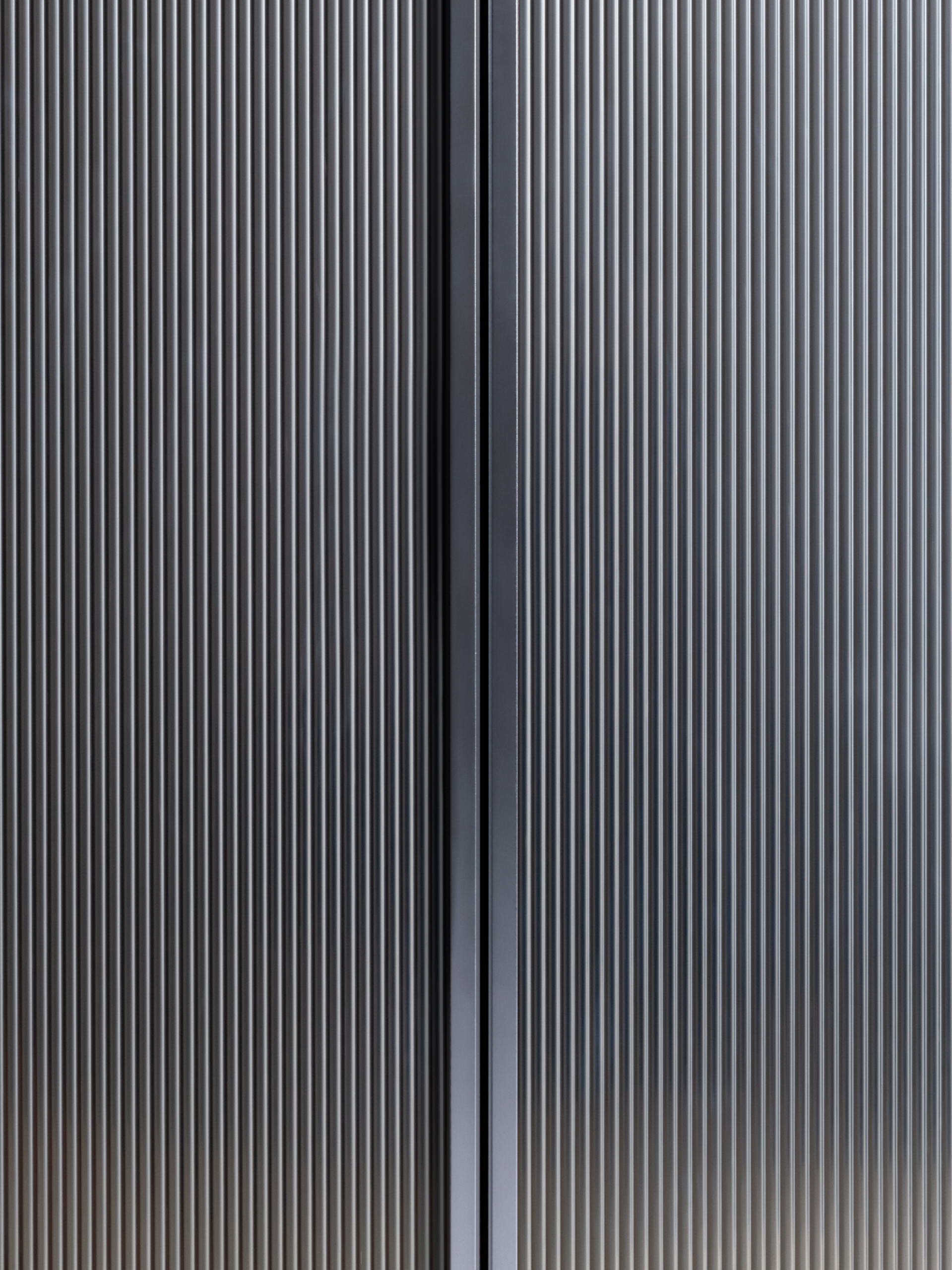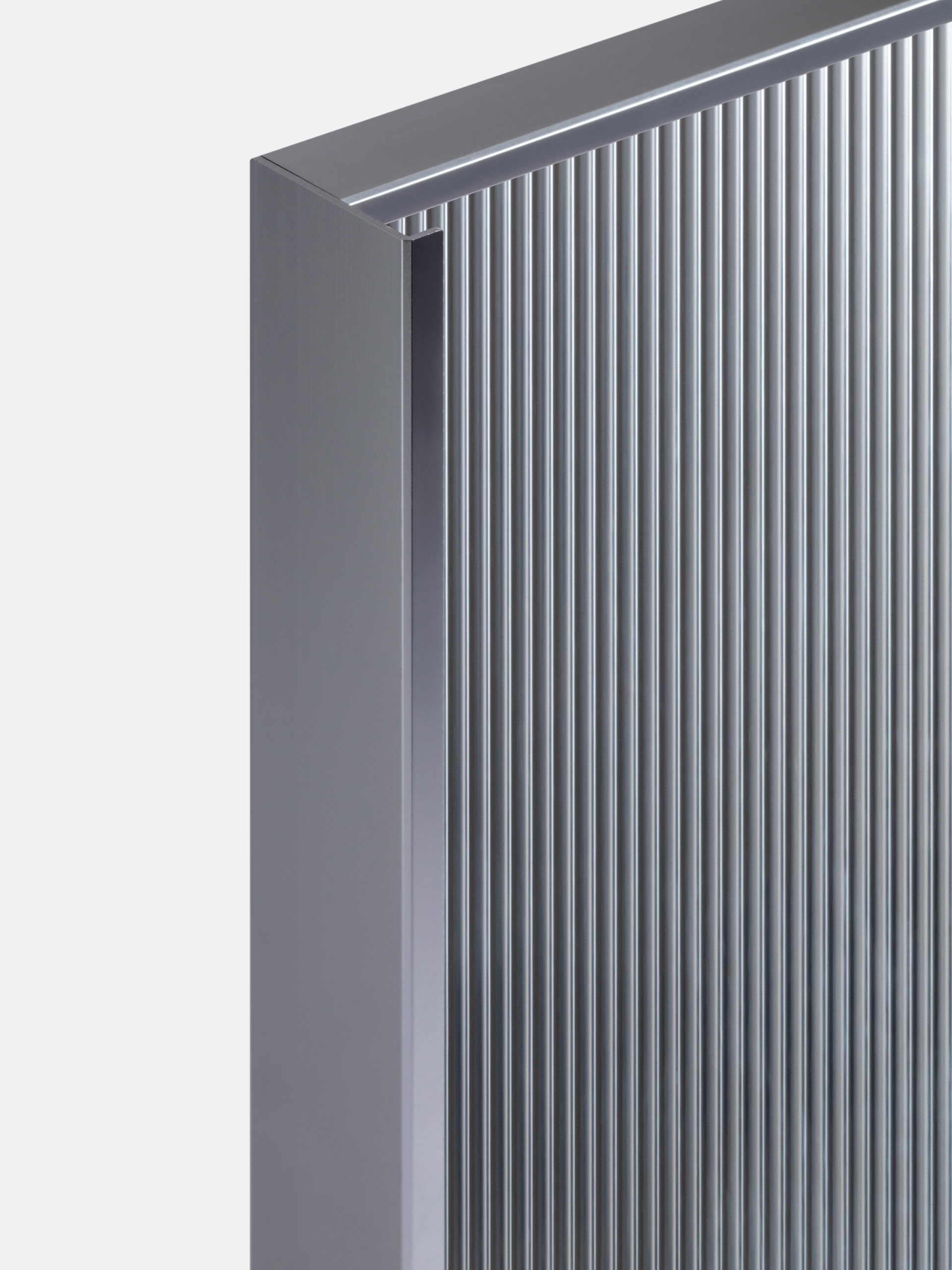 Brushed stainless steel with vertical ridges softly reflects its surroundings, creating a distinctive, evolving character in a natural steel finish.