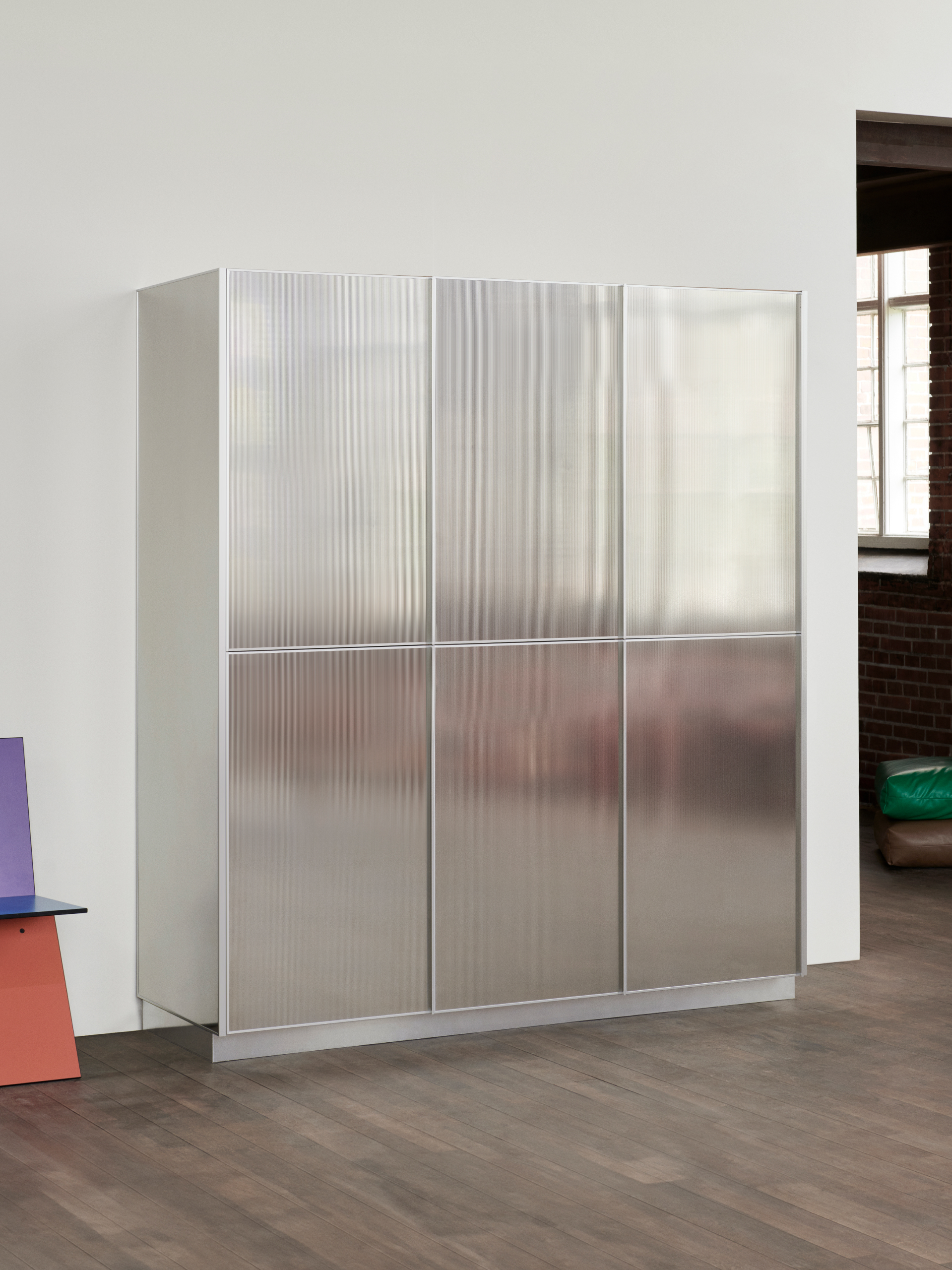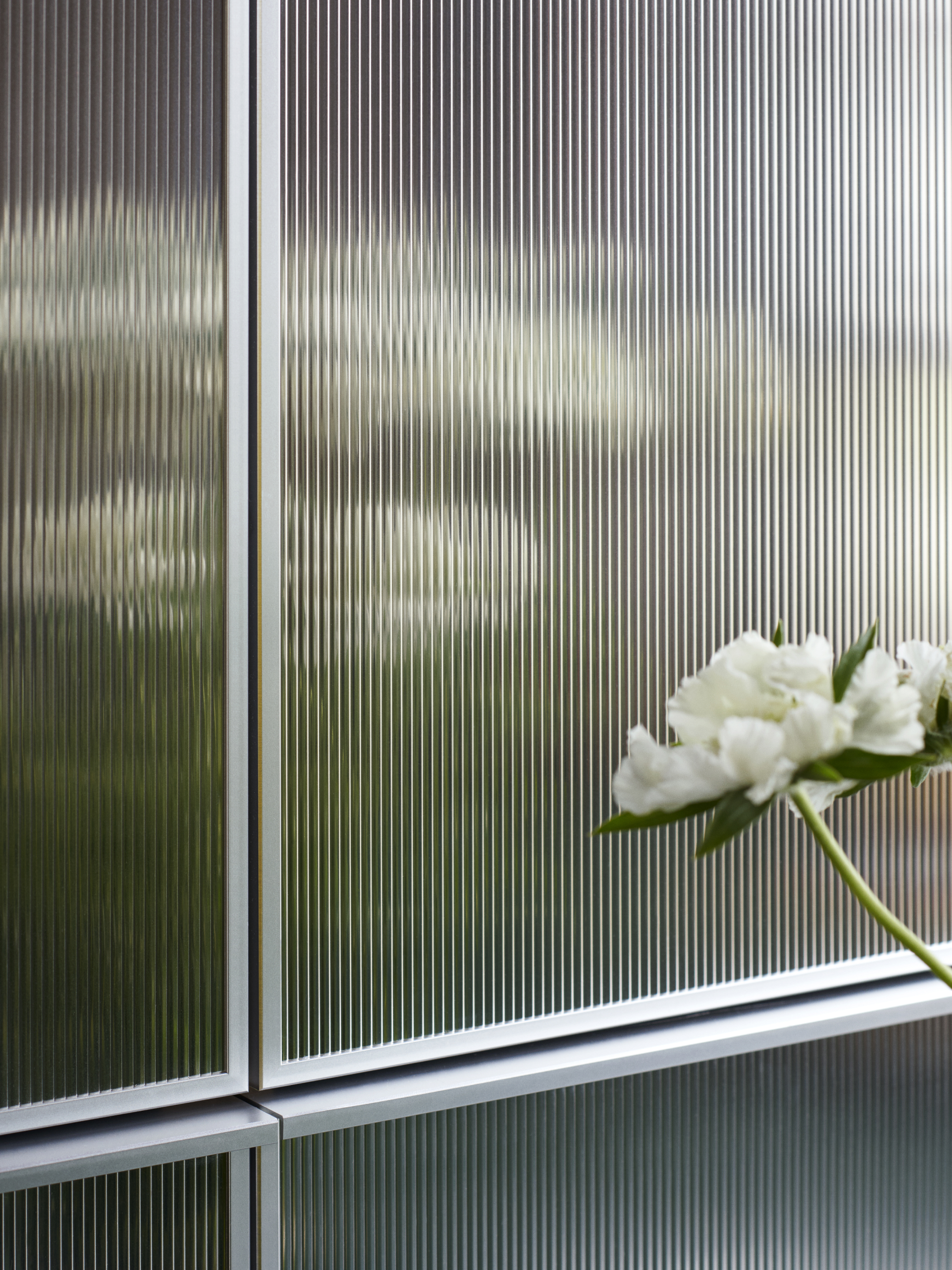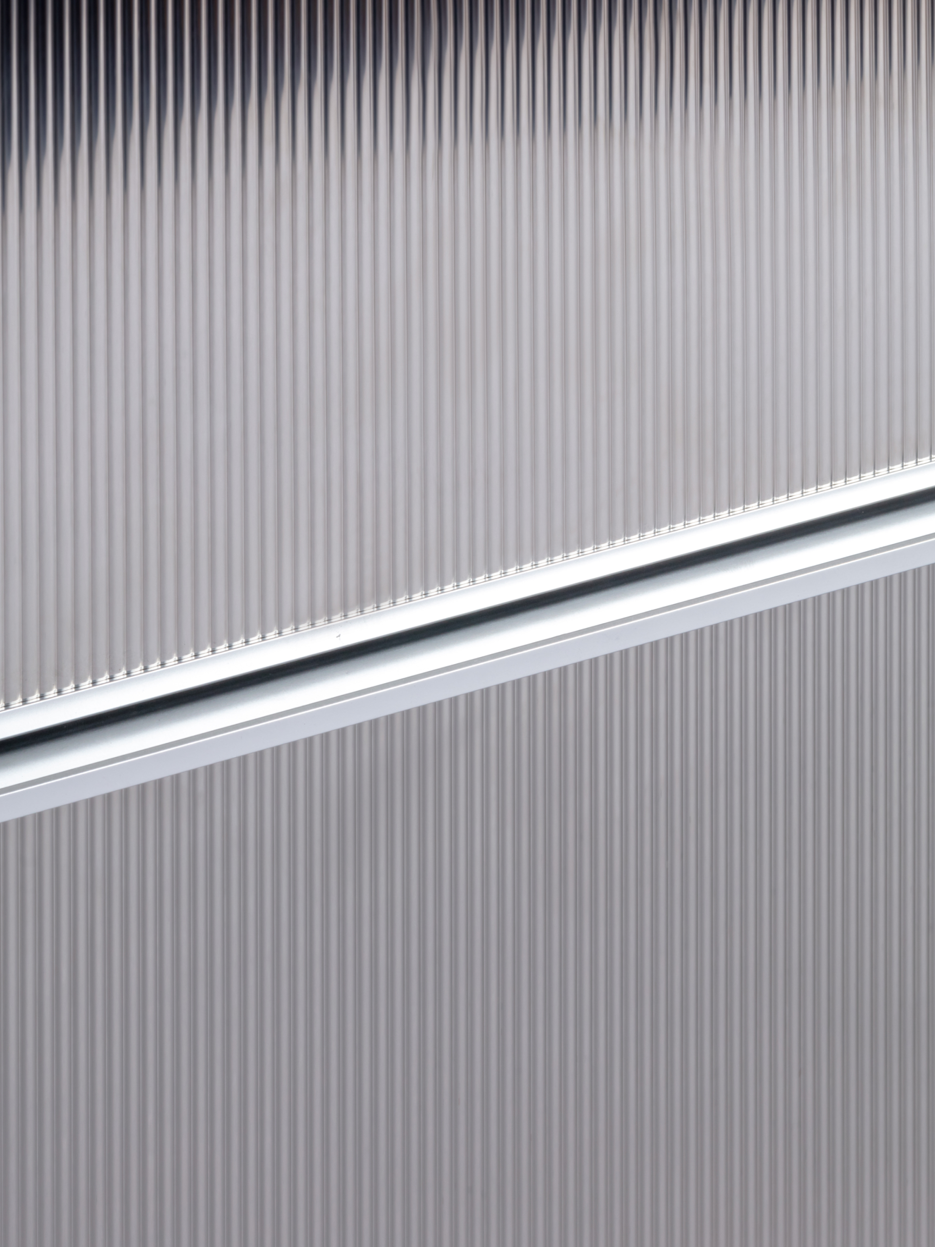 Brushed stainless steel with vertical ridges softly reflects its surroundings, creating a distinctive, evolving character in a natural steel finish.