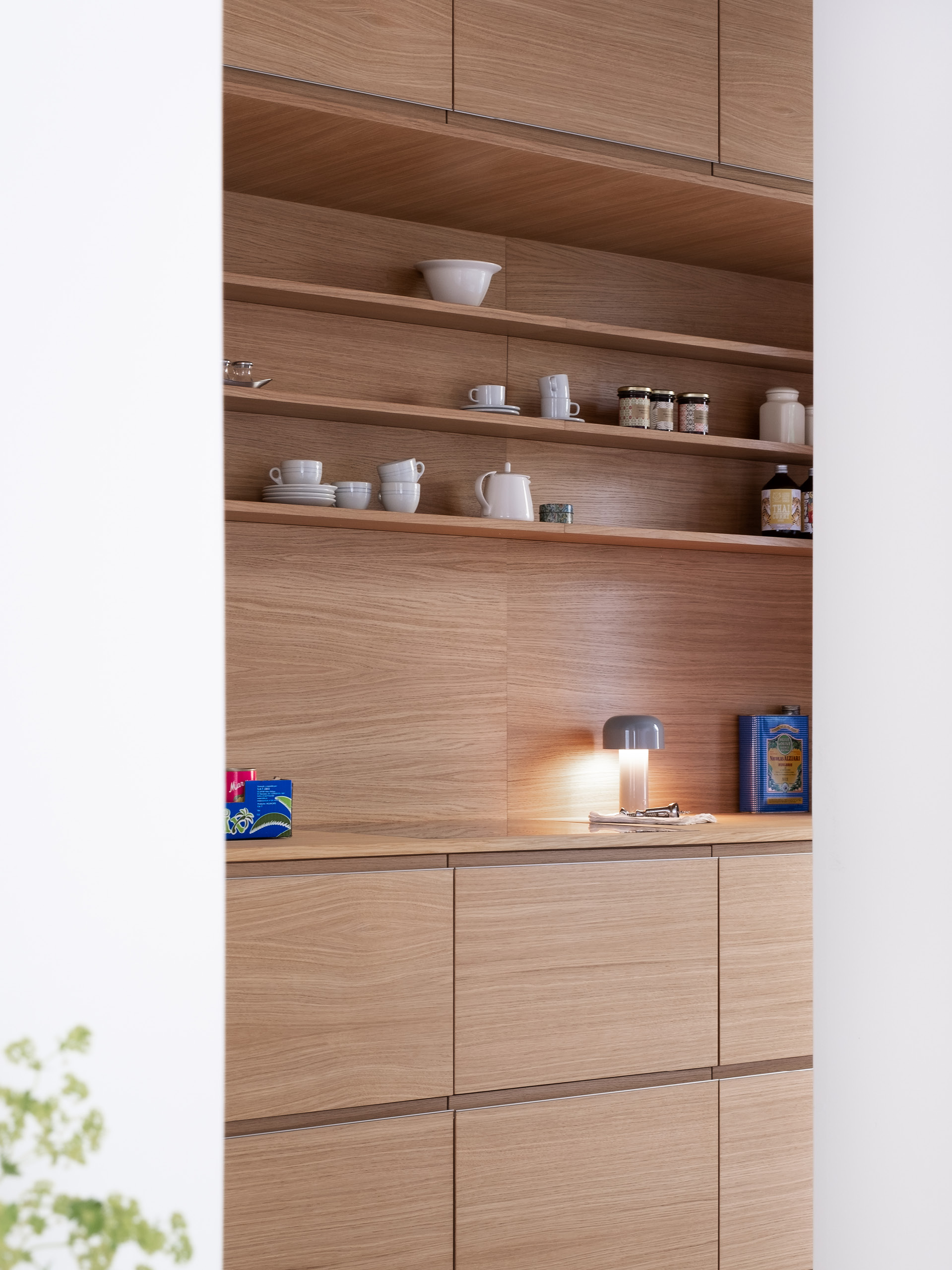 PROFILE is defined by a subtle interplay of form and function. Its signature rounded aluminum profile protects each front while doubling as an integrated handle—understated yet distinctive. Combined with warm textures and a monochrome palette, the design offers a calm, cohesive presence that complements the surrounding architecture.