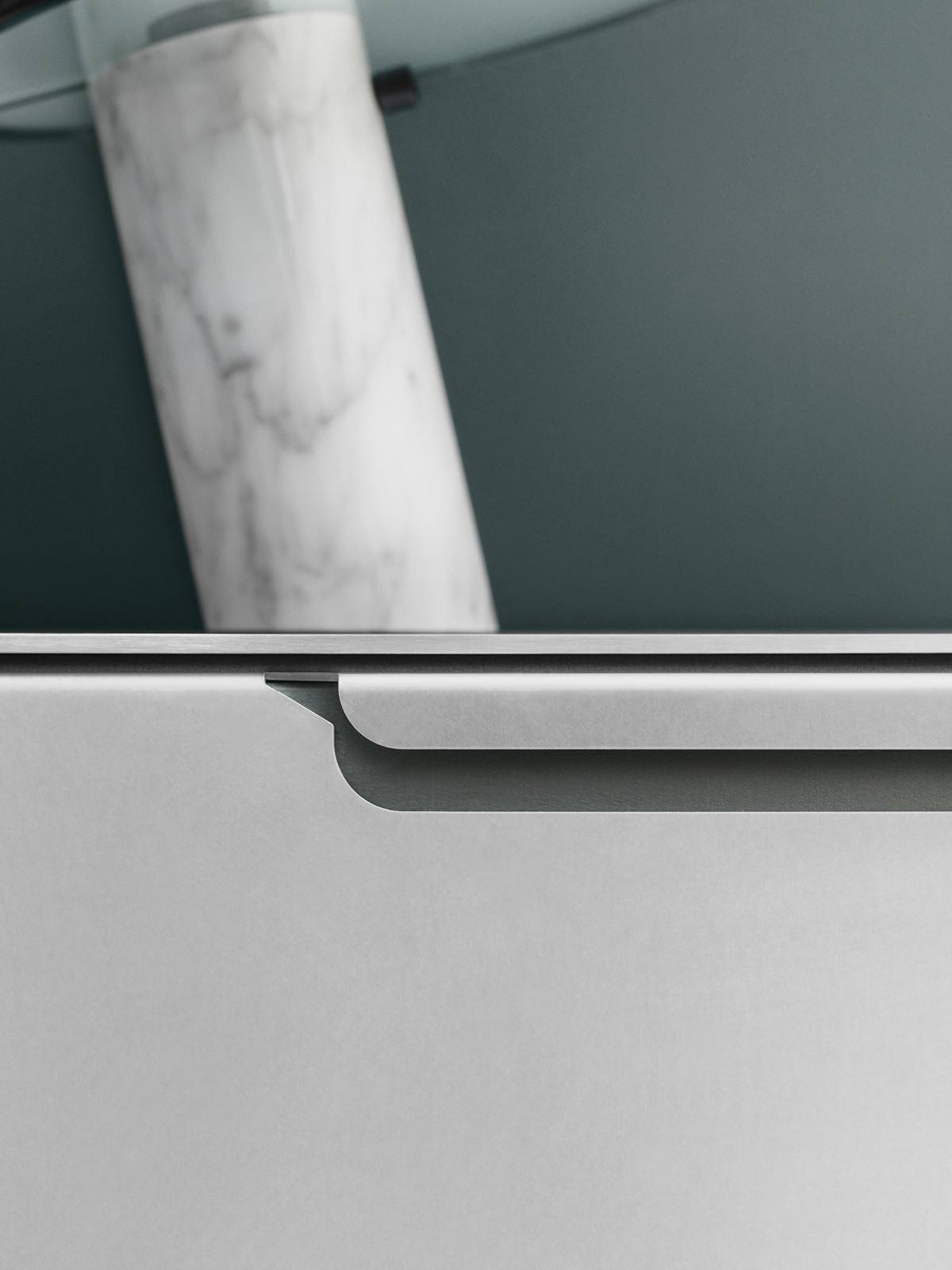 The FOLD handle is integrated in the design. It is made from a sheet of aluminum that is cut, folded, and welded around a laminated board.