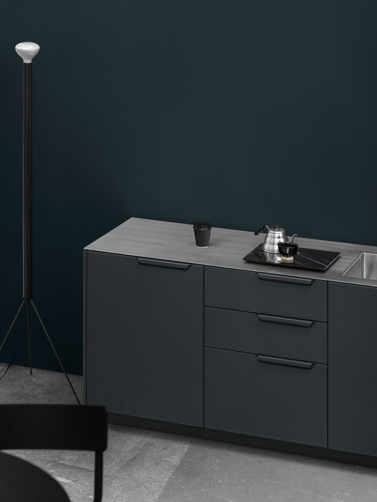 Available in two variants of aluminum: a raw, brushed aluminum version and a powder-coated version in the color 'anthracite'.