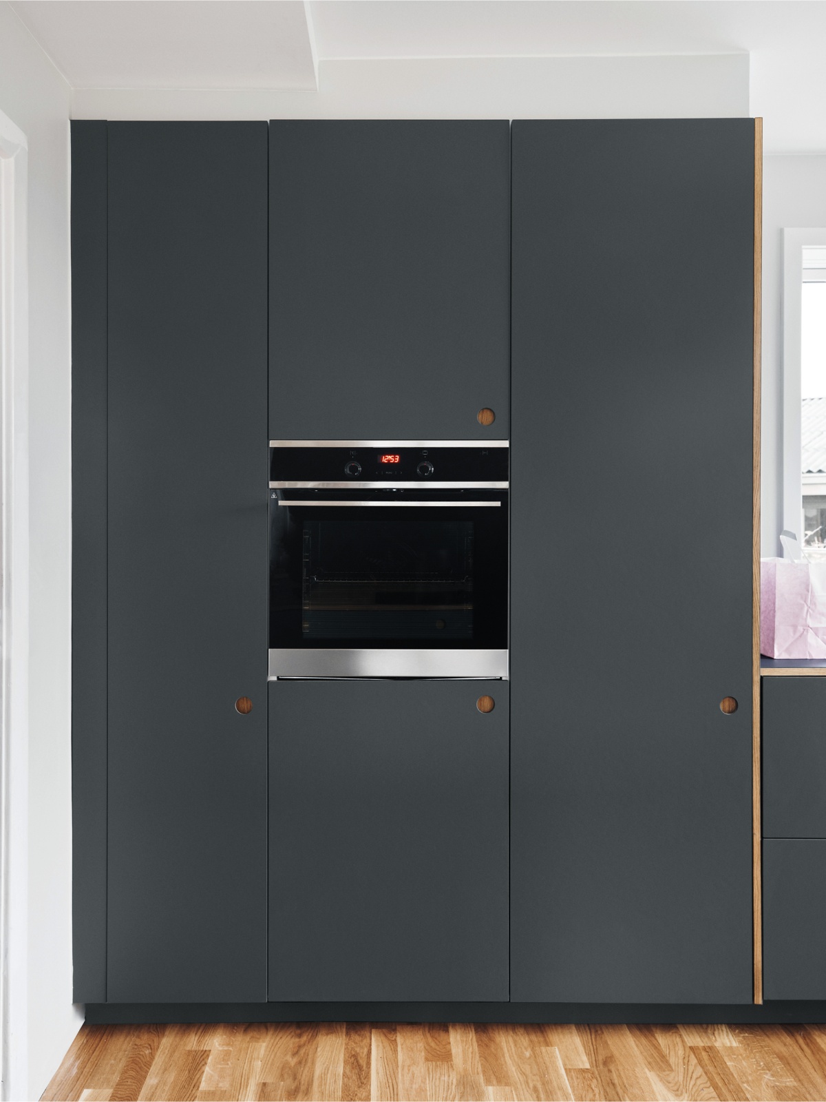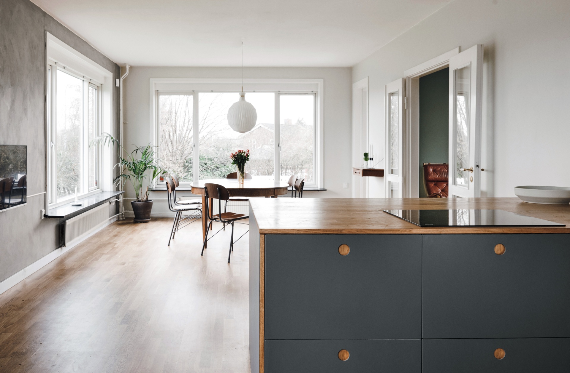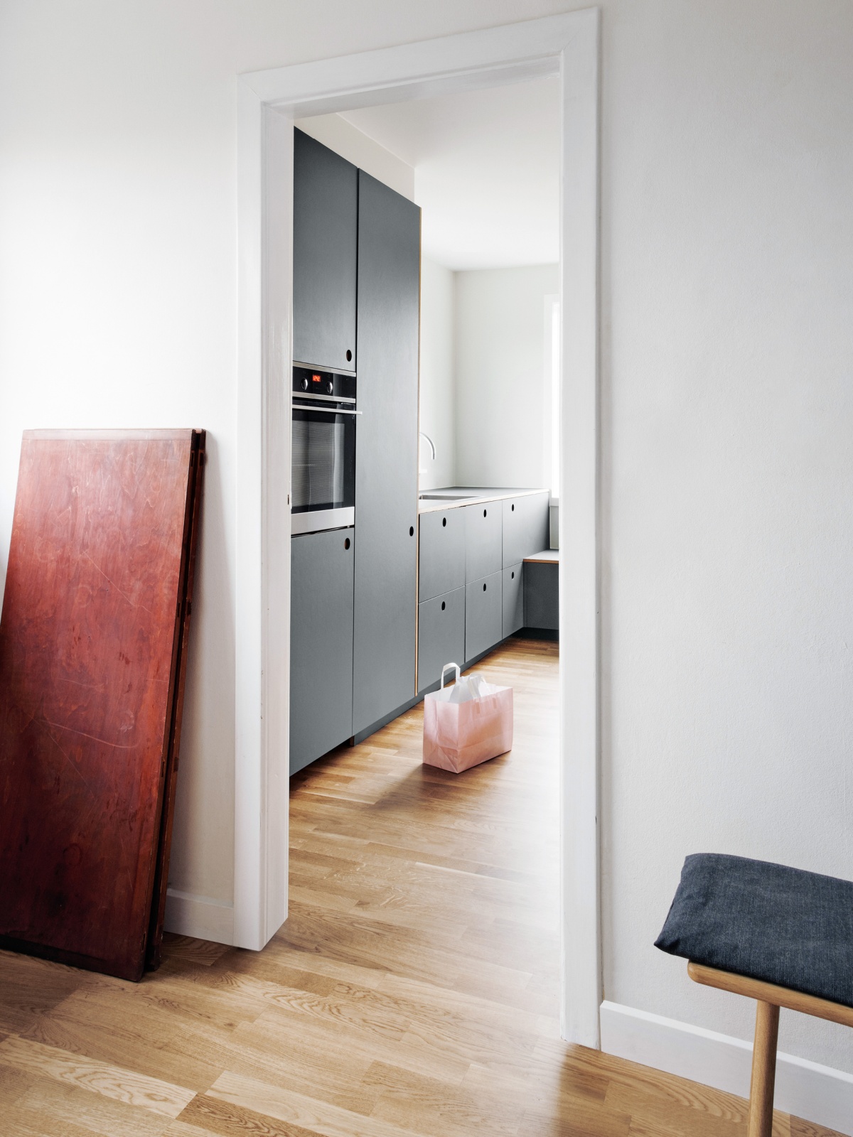 Calming natural wood to balance a colorful apartment