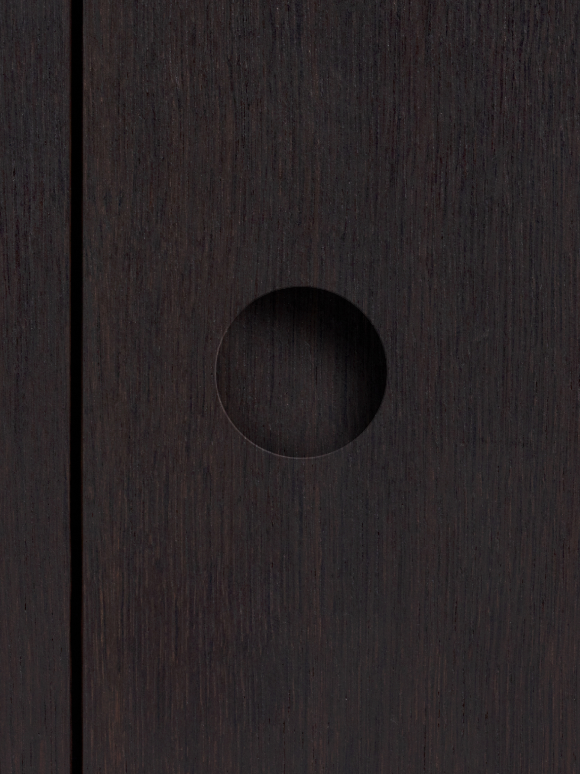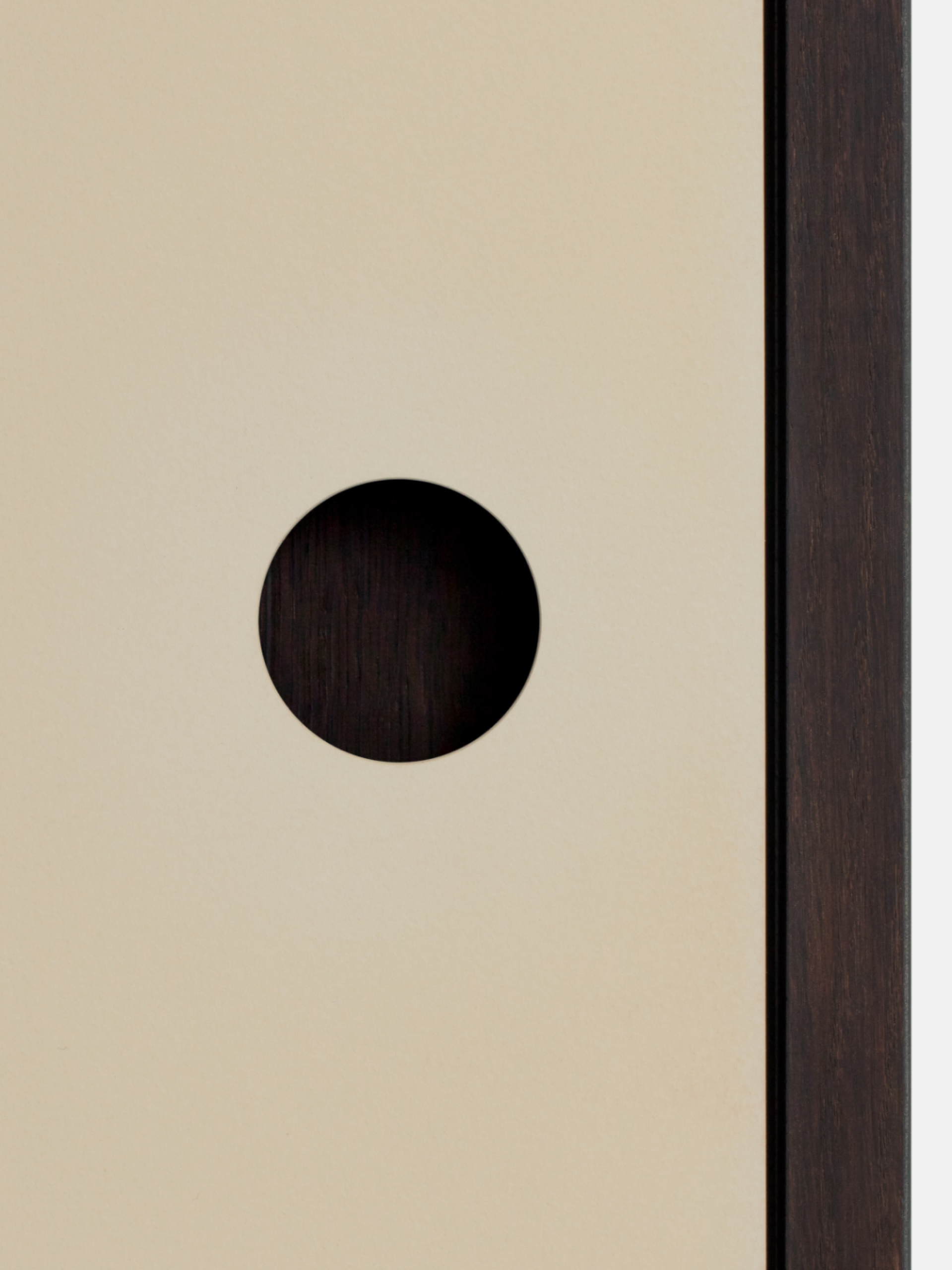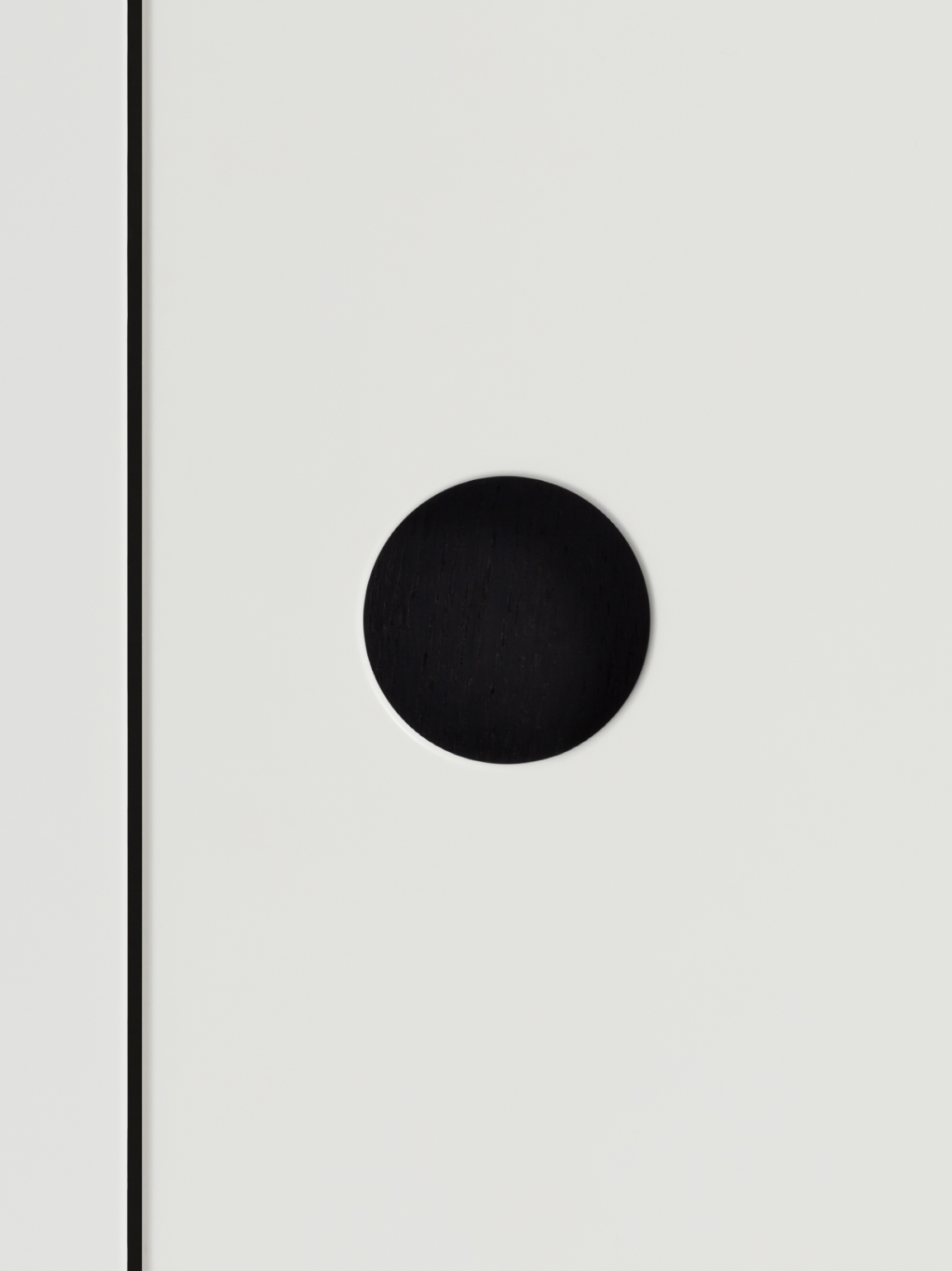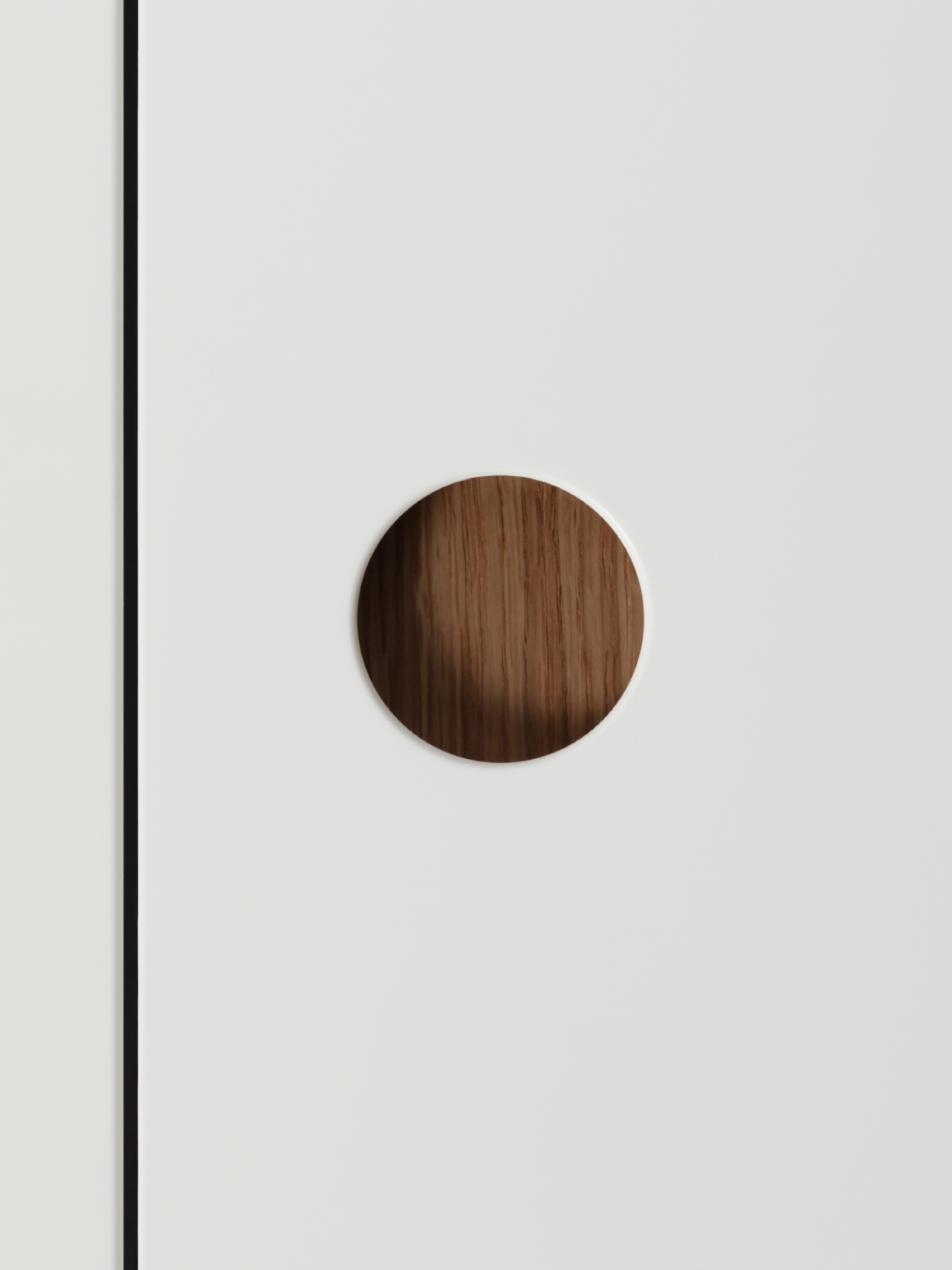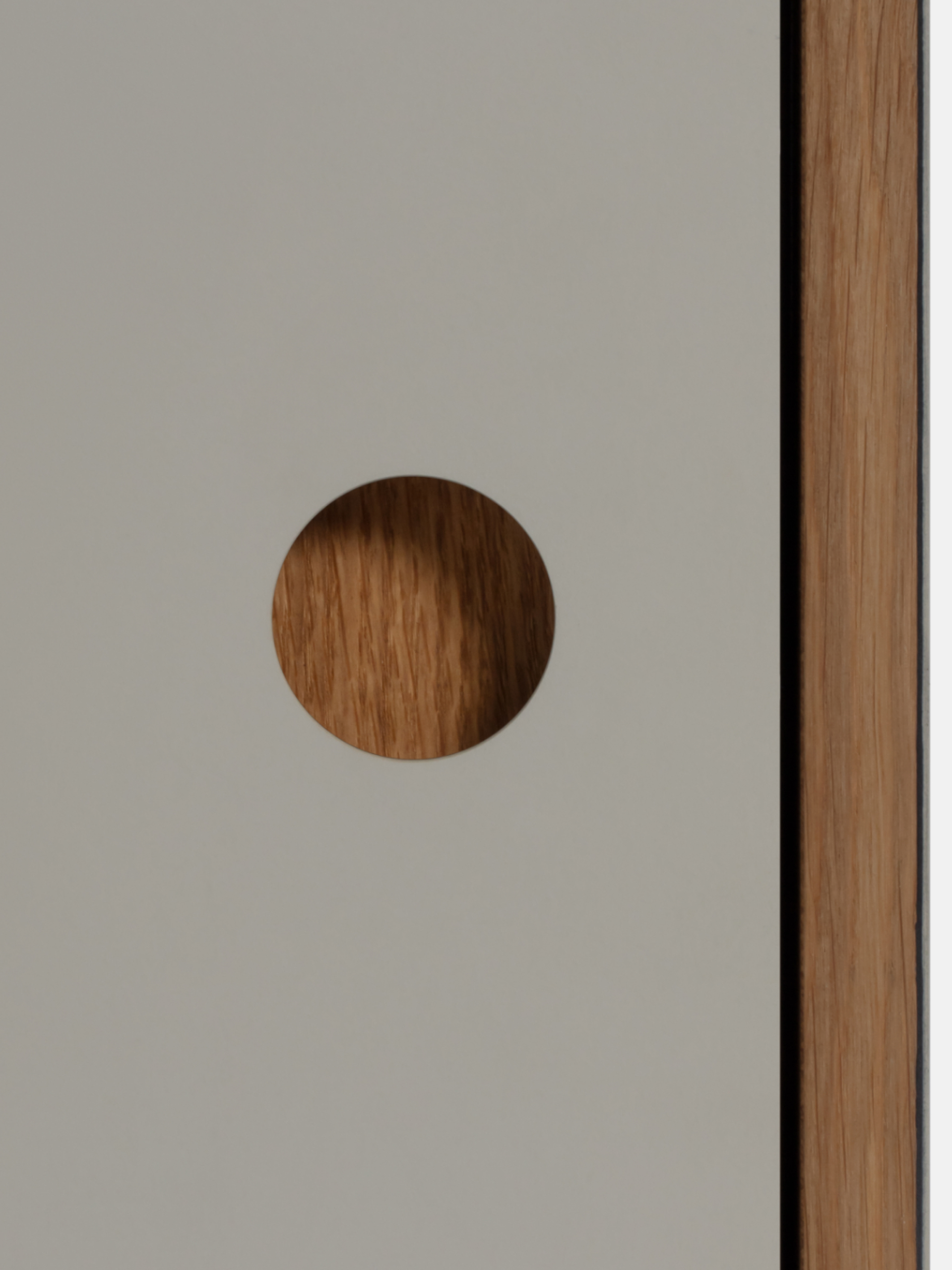 The BASIS handle is circular, measuring 1 ¾" / 44 mm in diameter, and is available in natural oak, smoked oak, or spray-painted veneered oak with a visible wood grain.