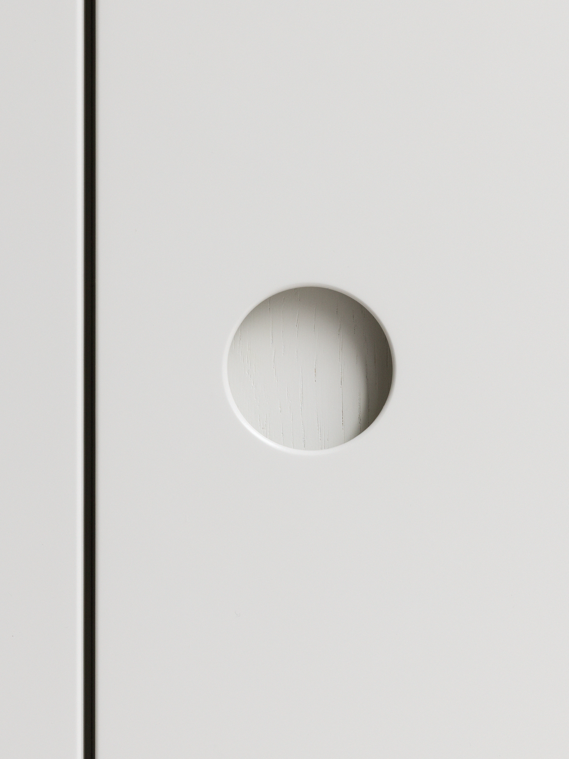 The collection is available in veneered oak, linoleum, and painted. All variants are characterized by the classic carpenter-milled-in round handle.